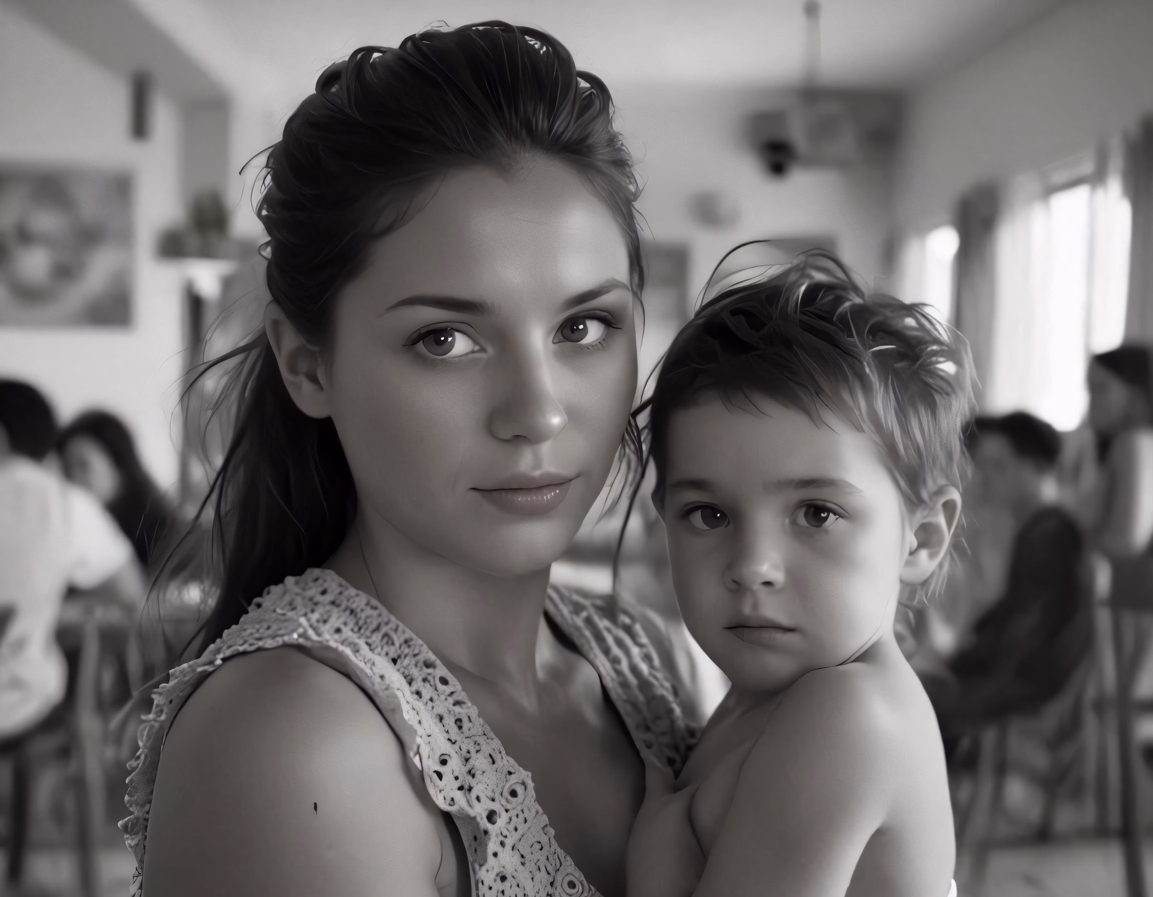 High resolution picture, free to use, a woman and her child are posing for a black and white photo