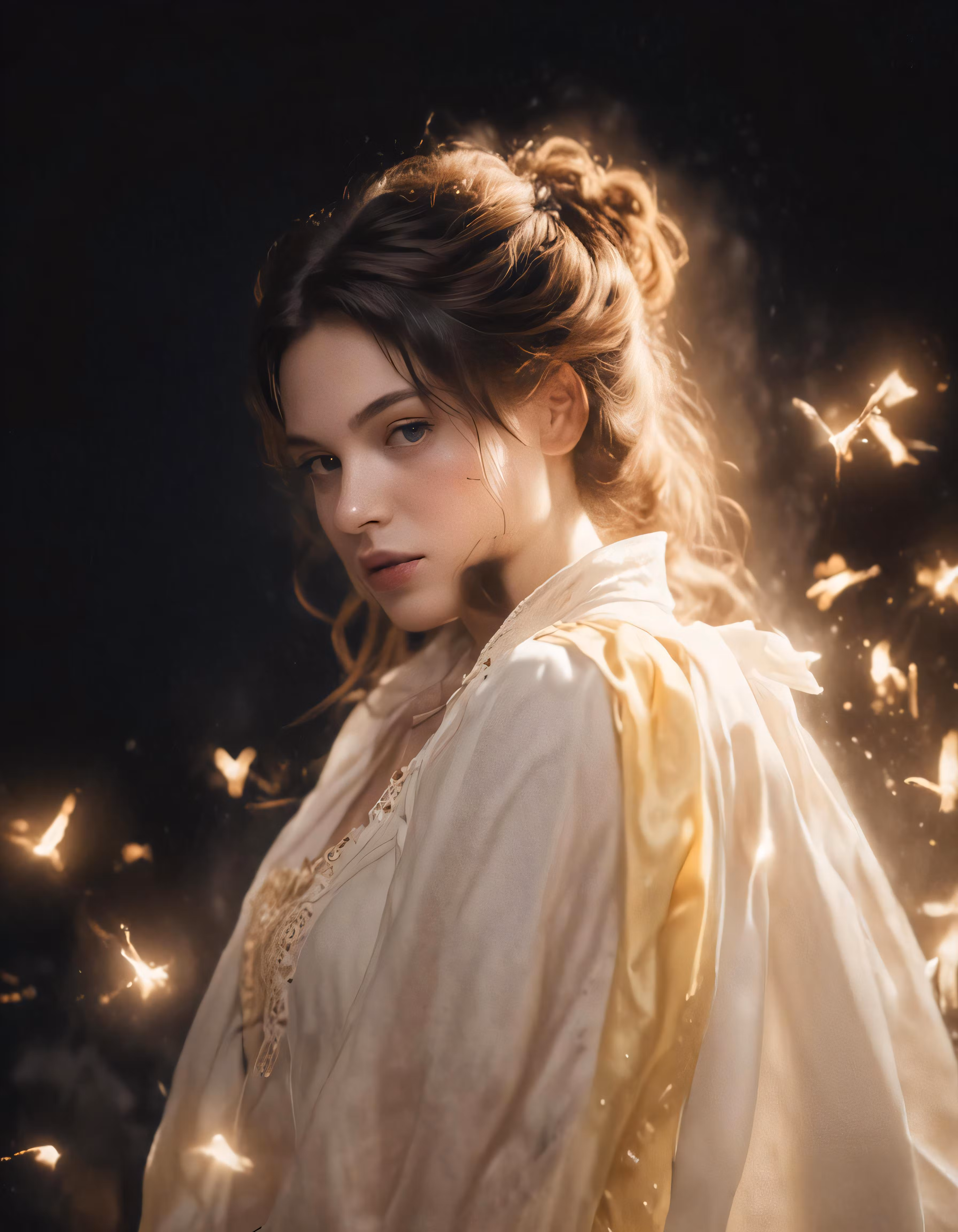 High resolution picture, free to use, a woman dressed as a princess in the air with fireworks