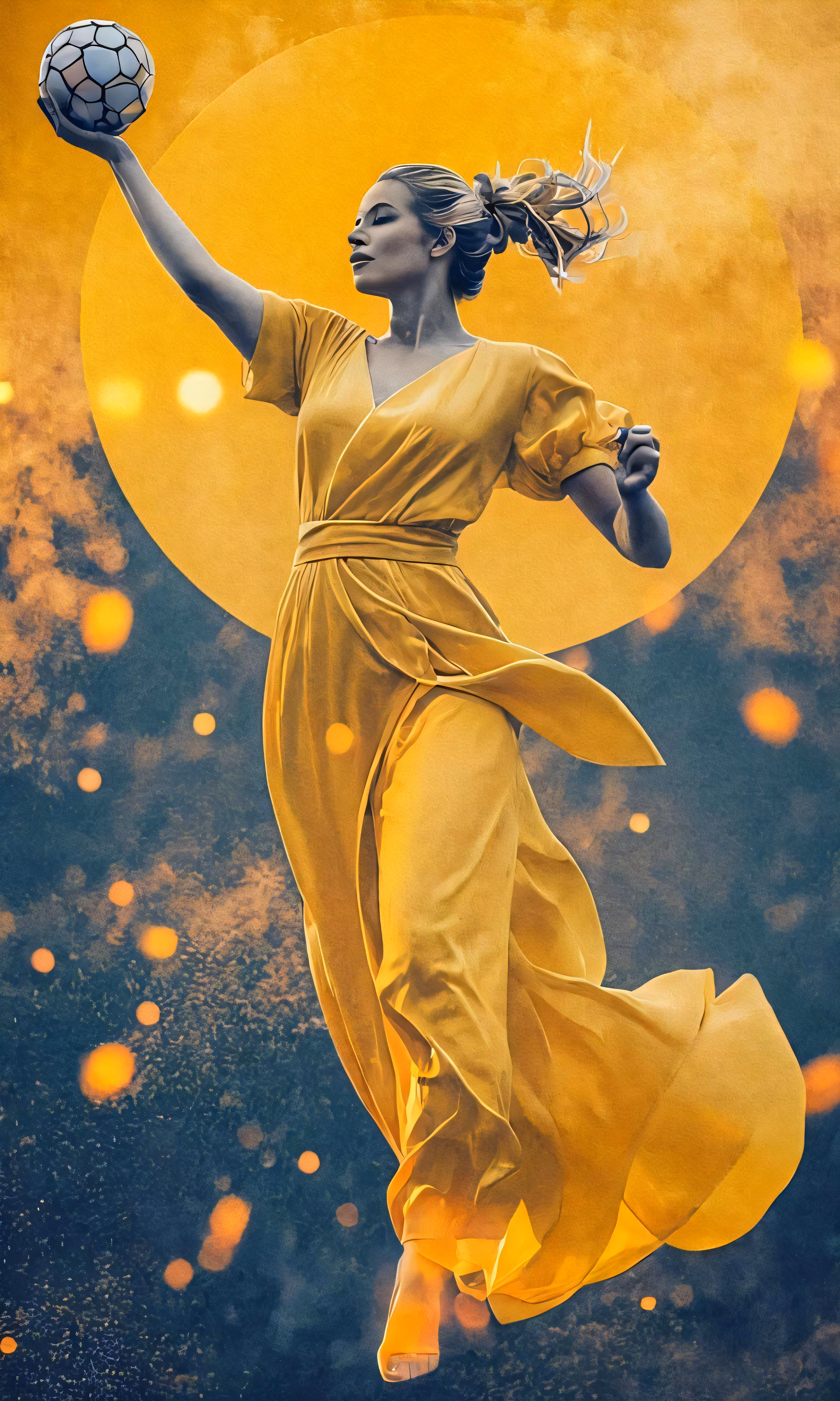 High resolution picture, free to use, a woman dressed in yellow holding a soccer ball