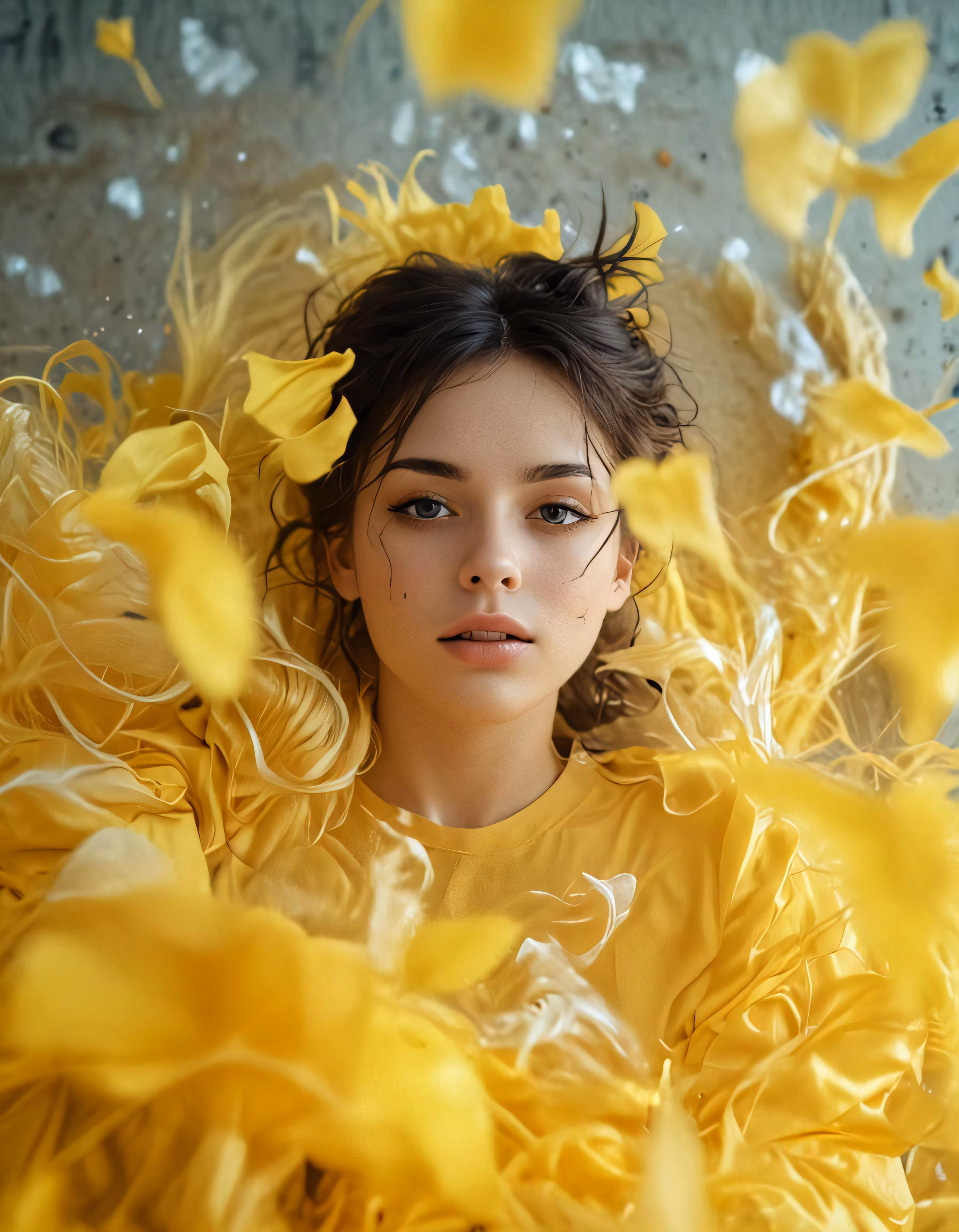 High resolution picture, free to use, a woman dressed in yellow sitting in the rain