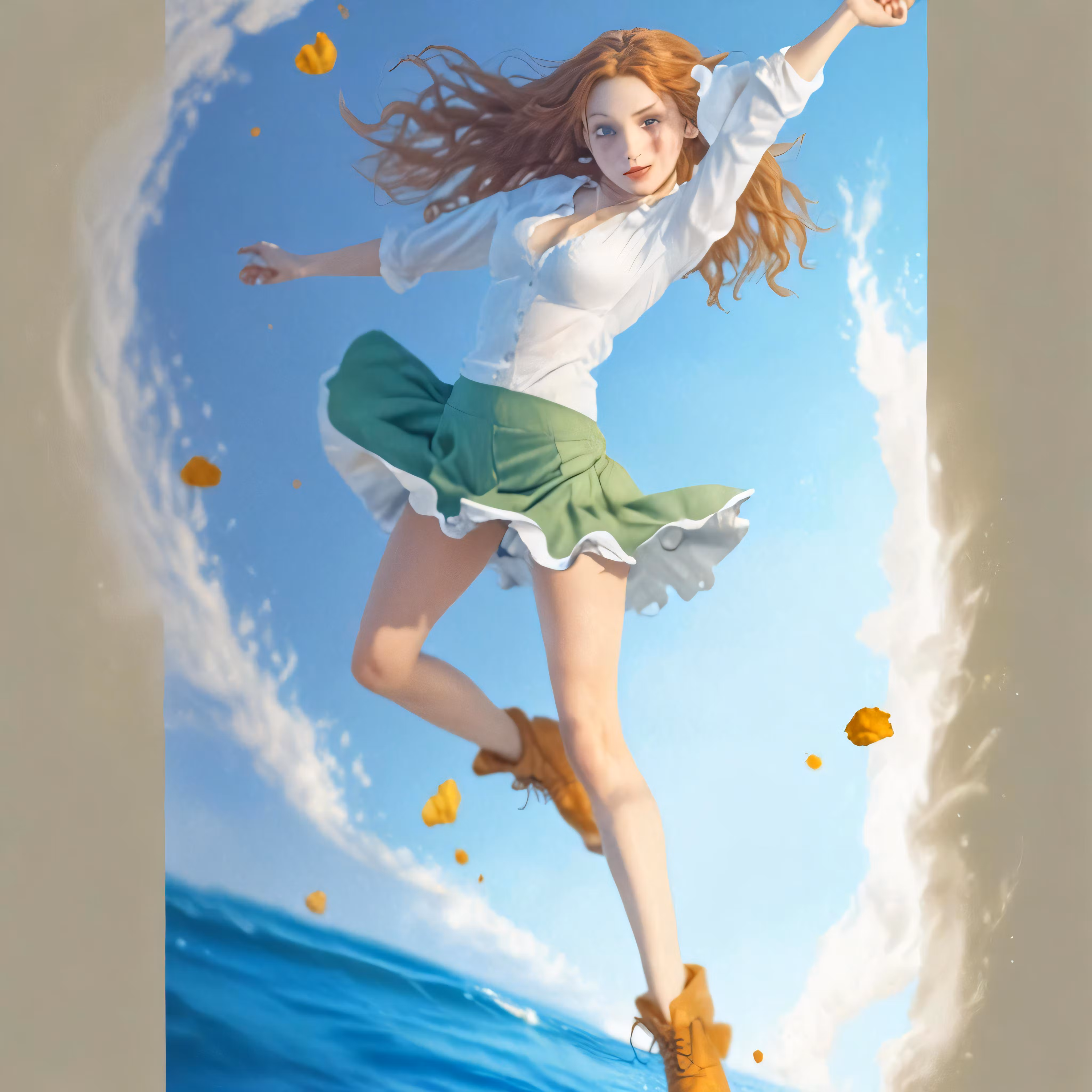High resolution picture, free to use, a woman flying through the air on top of a pair of yellow boots