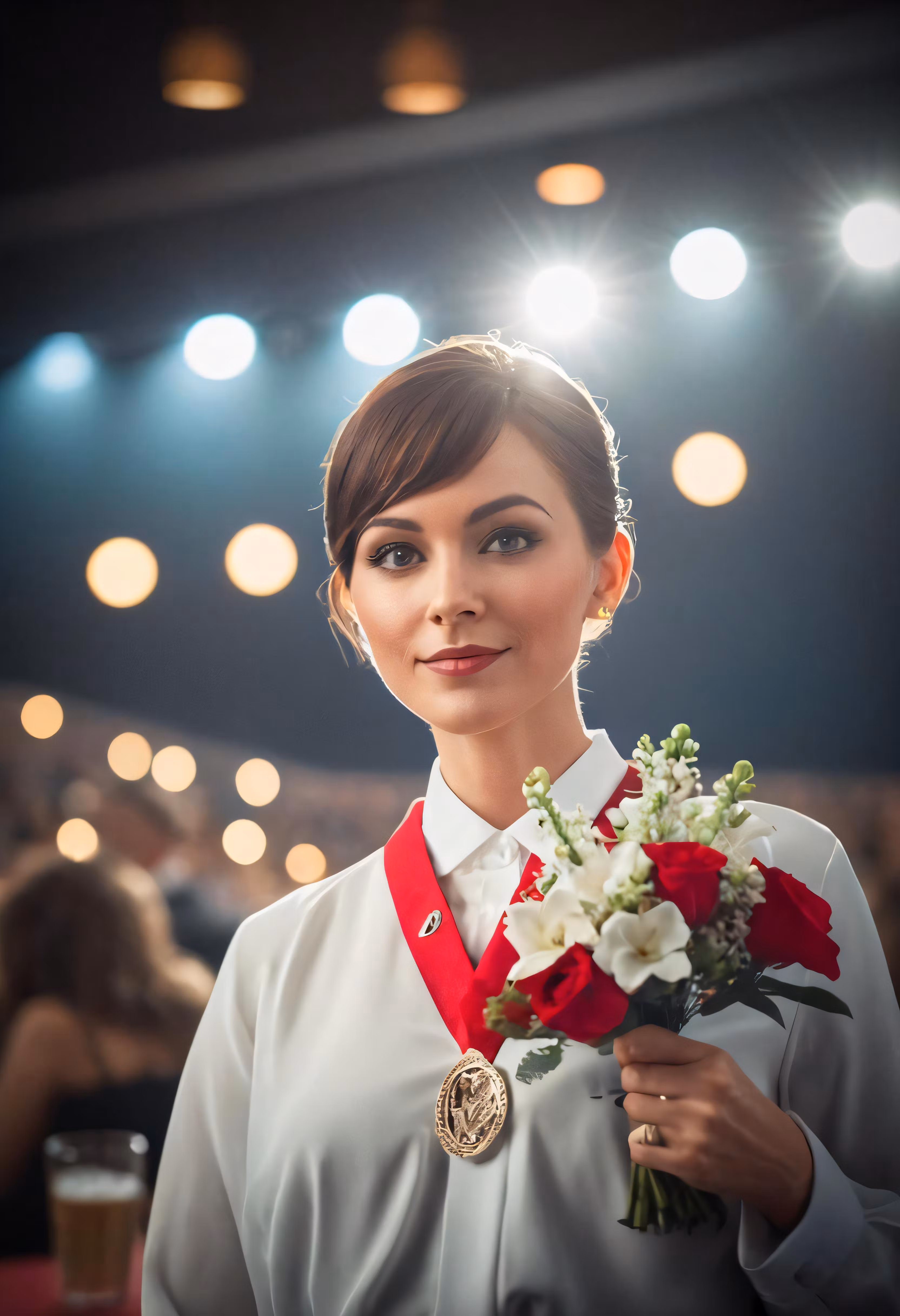 High resolution picture, free to use, a woman holding a bouquet with white flowers in front of people
