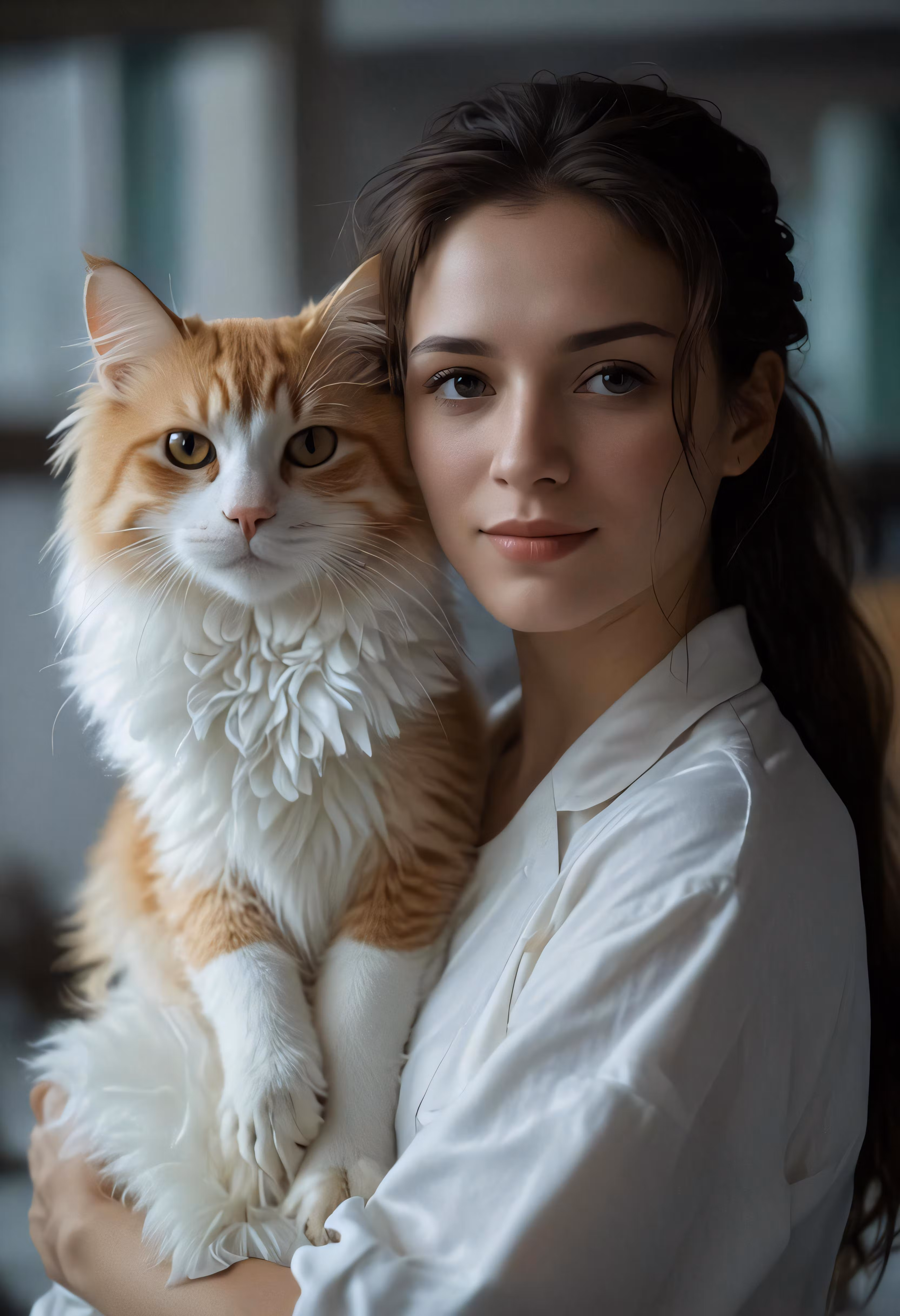 High resolution picture, free to use, a woman holding a white and orange cat in her hands