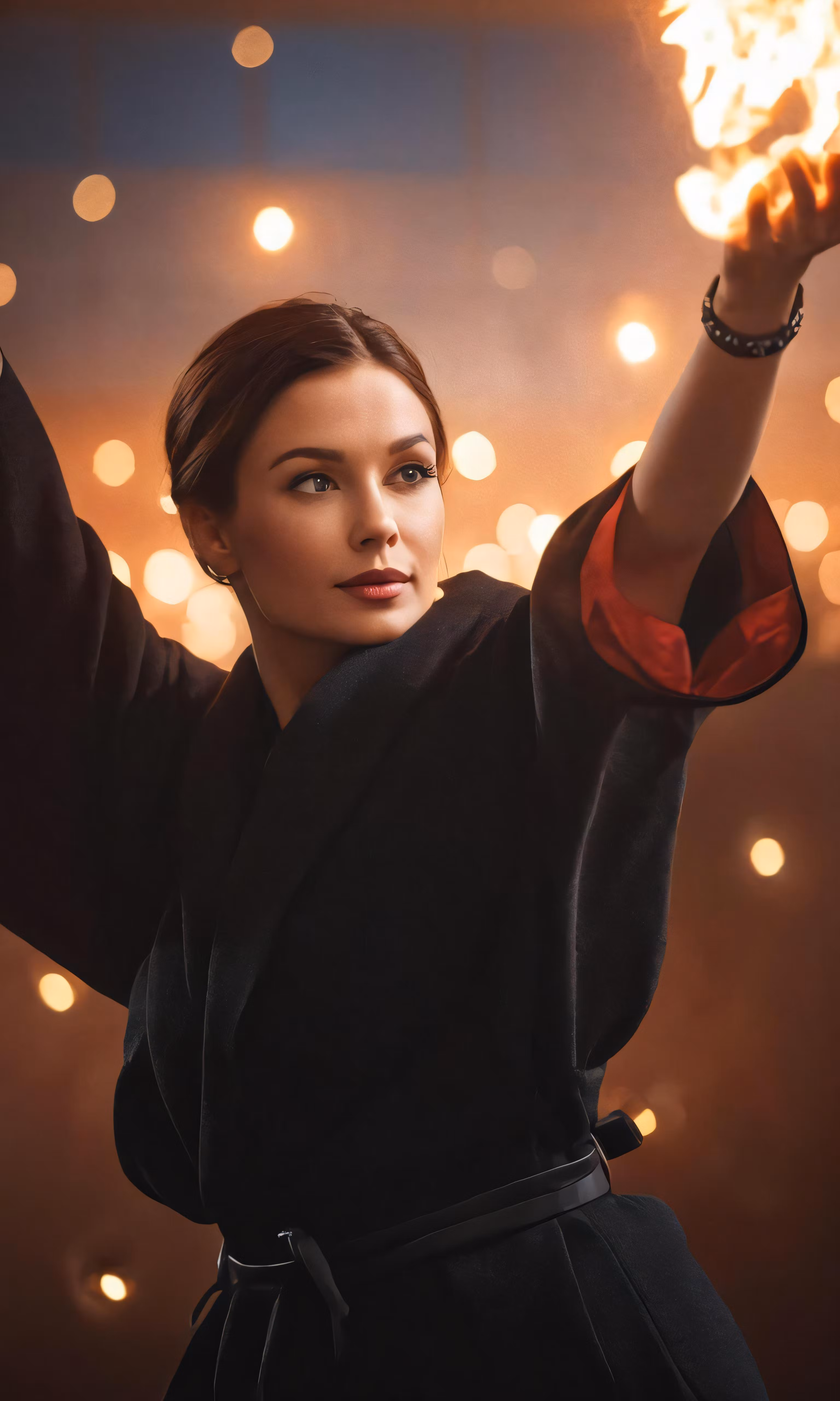 High resolution picture, free to use, a woman holding fireball with a black dress
