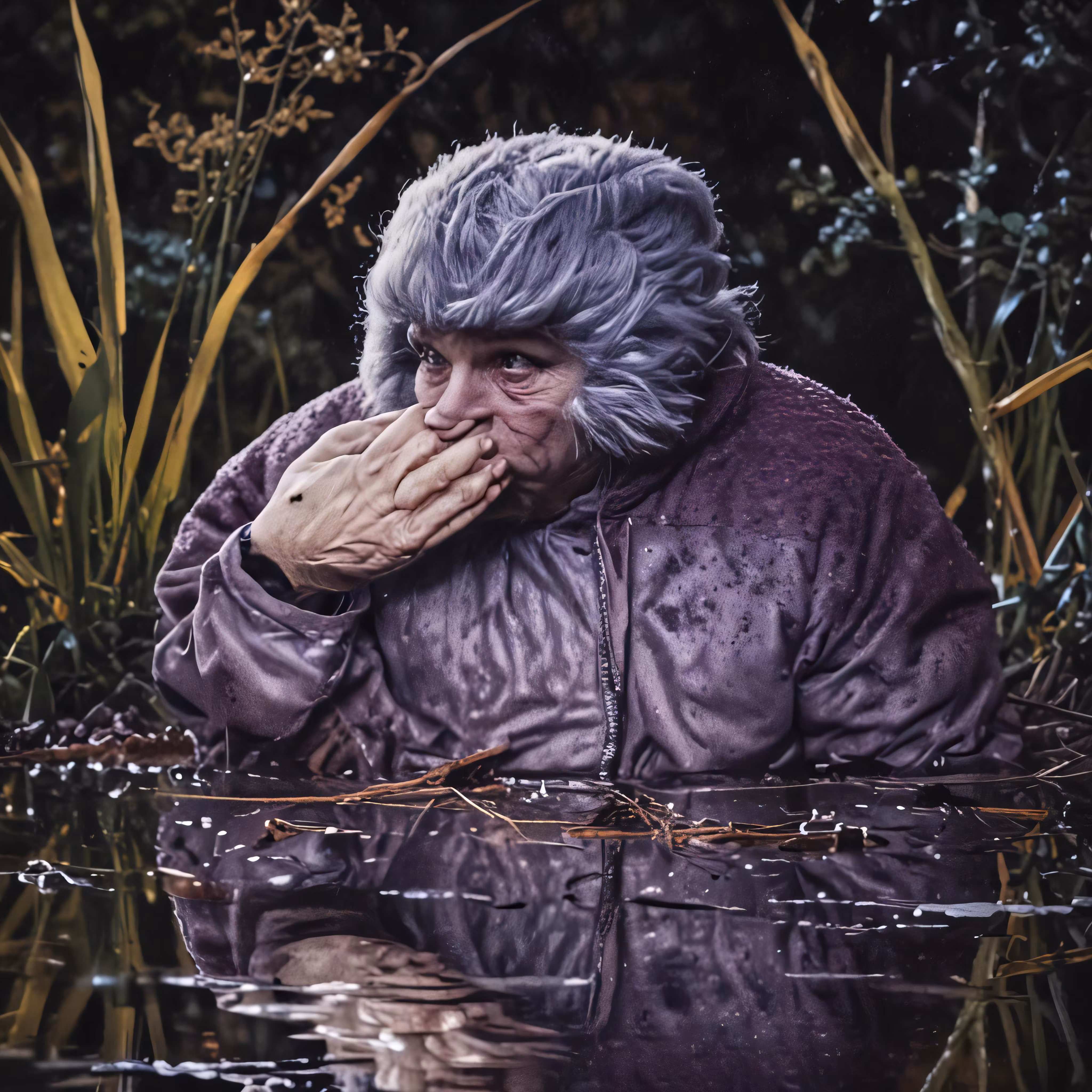 High resolution picture, free to use, a woman holding her hands together near a body of water