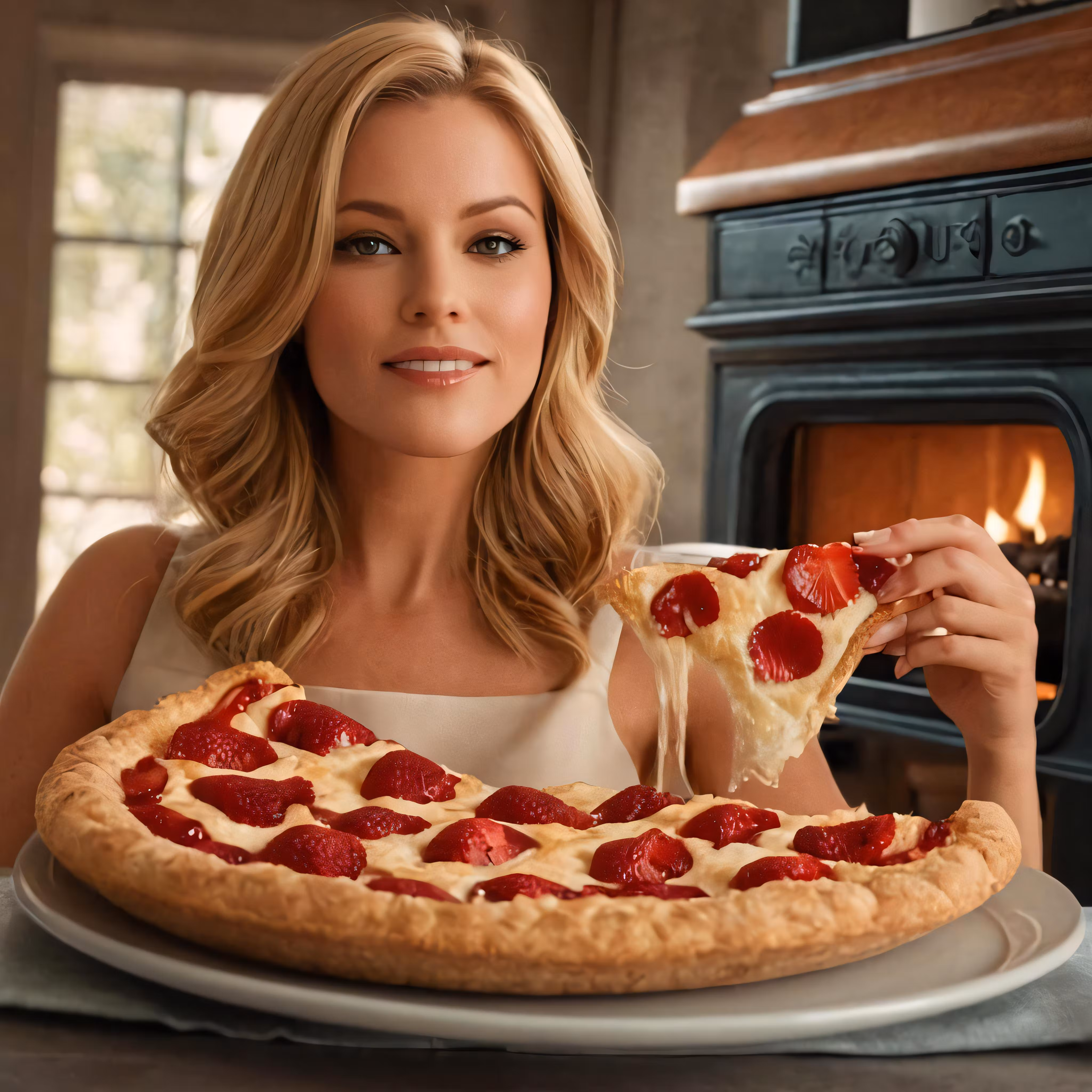 High resolution picture, free to use, a woman holding up a slice of pizza in front of the fireplace
