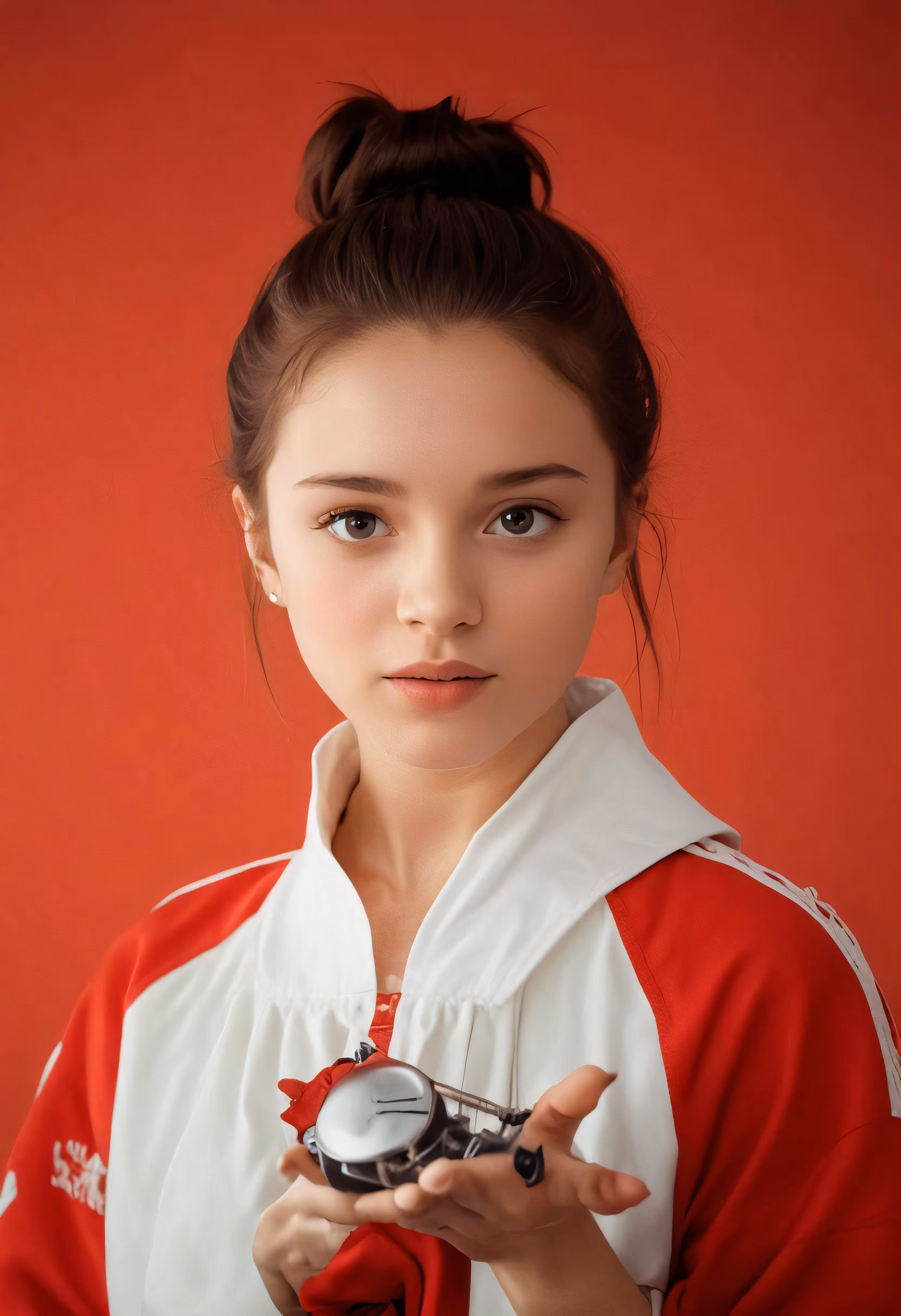 High resolution picture, free to use, a woman holds an old camera and looks into the camera