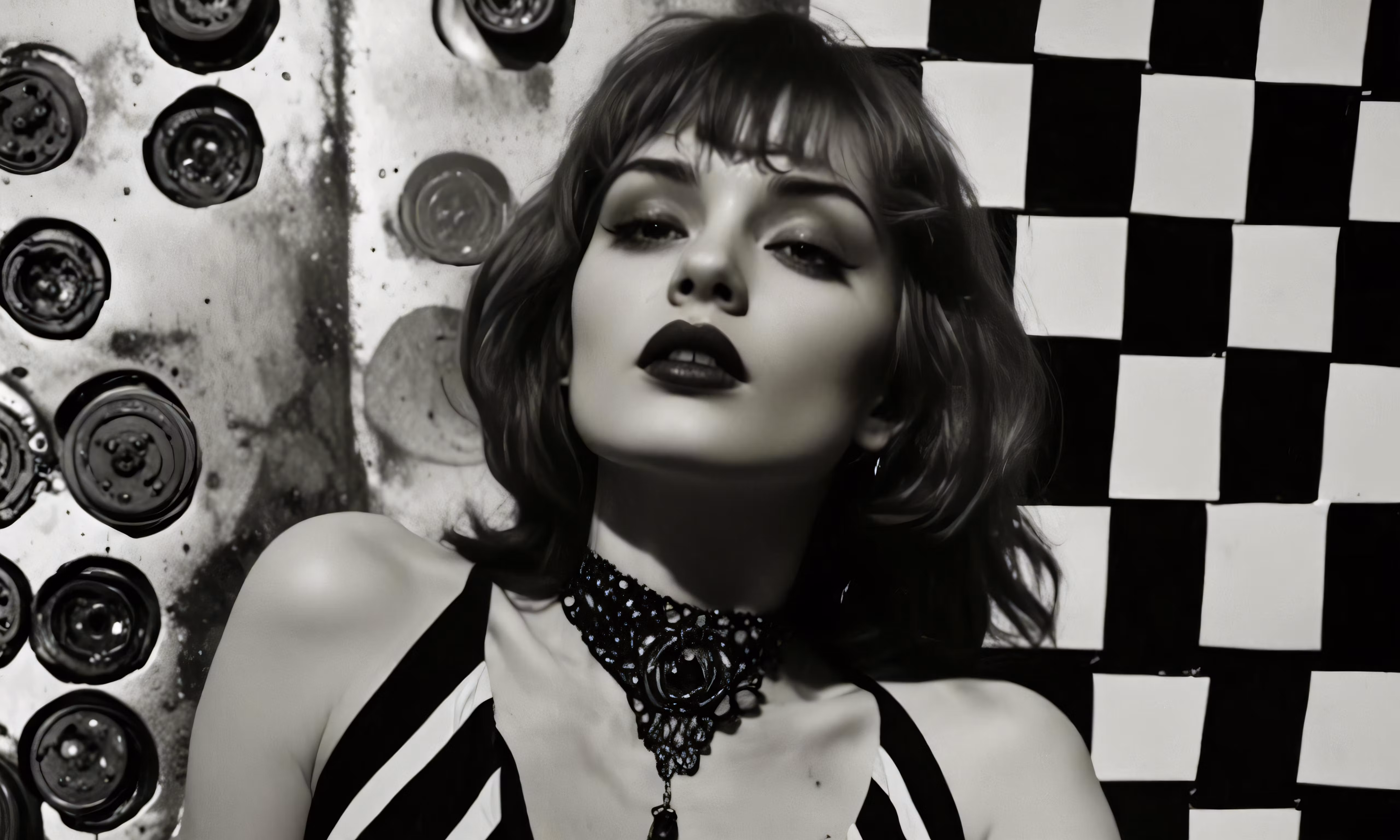 High resolution picture, free to use, a woman in a black and white dress and an elaborate necklace
