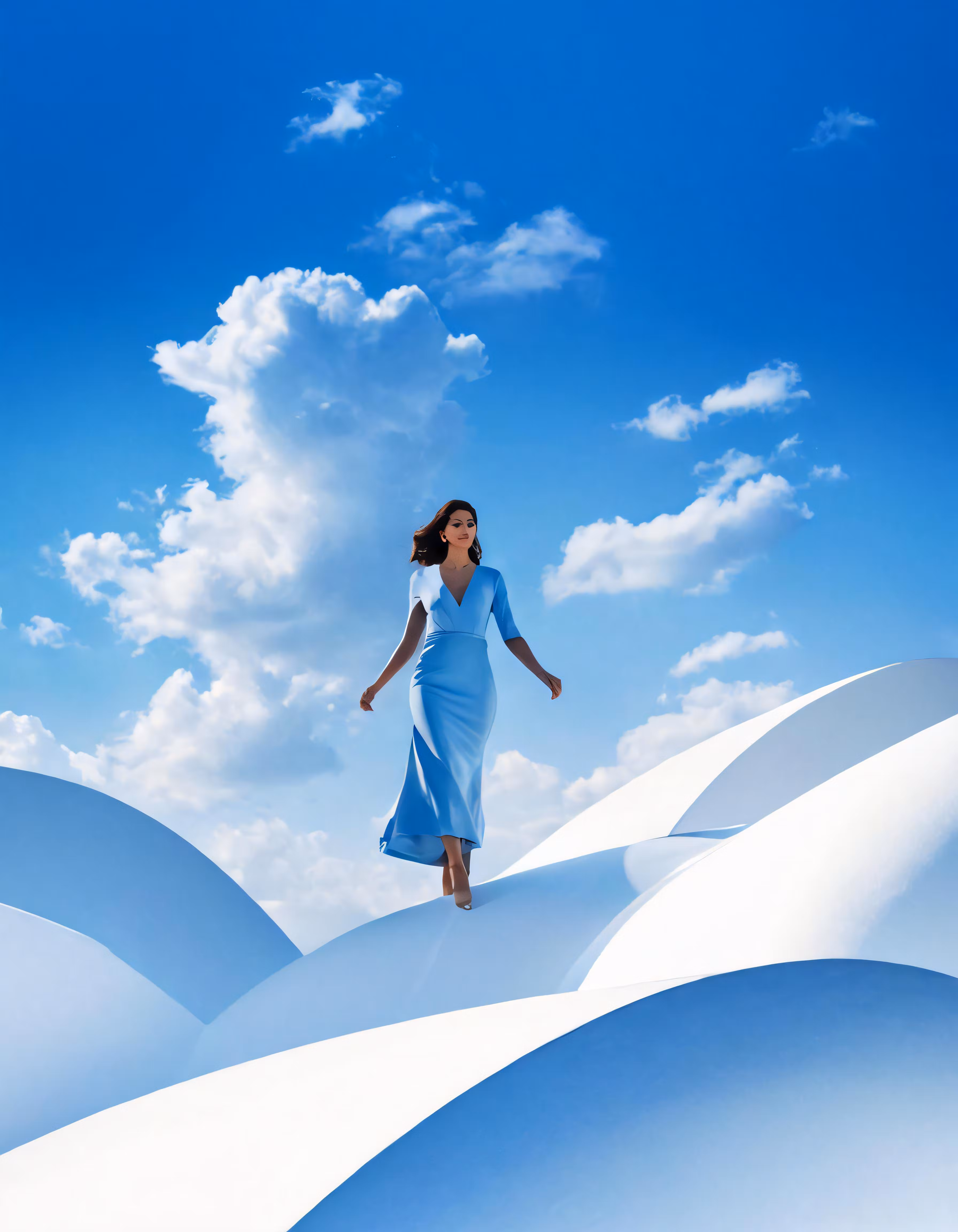High resolution picture, free to use, a woman in a blue dress walks across a white landscape