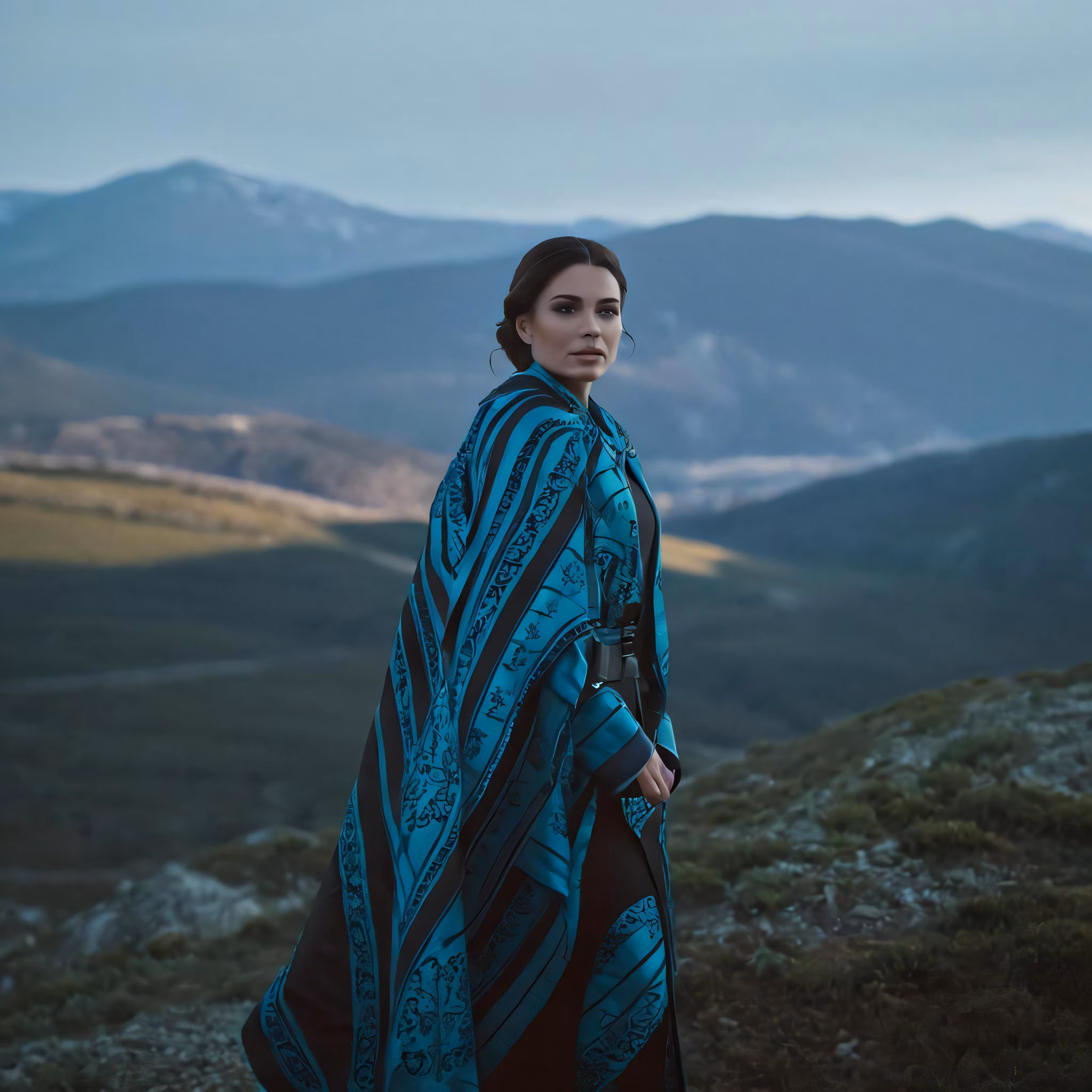 High resolution picture, free to use, a woman in a blue shawl on top of a mountain