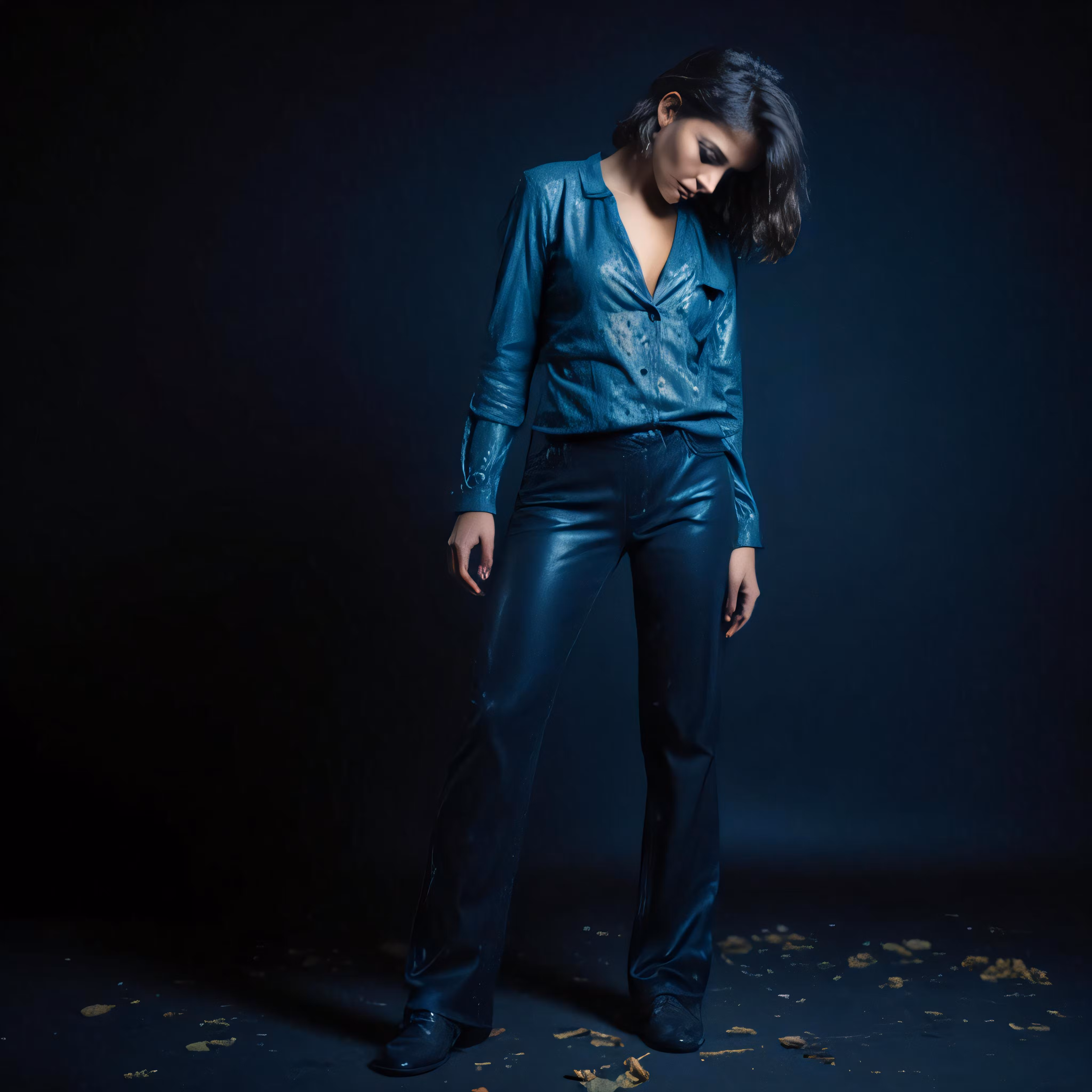High resolution picture, free to use, a woman in a blue top and metallic pants