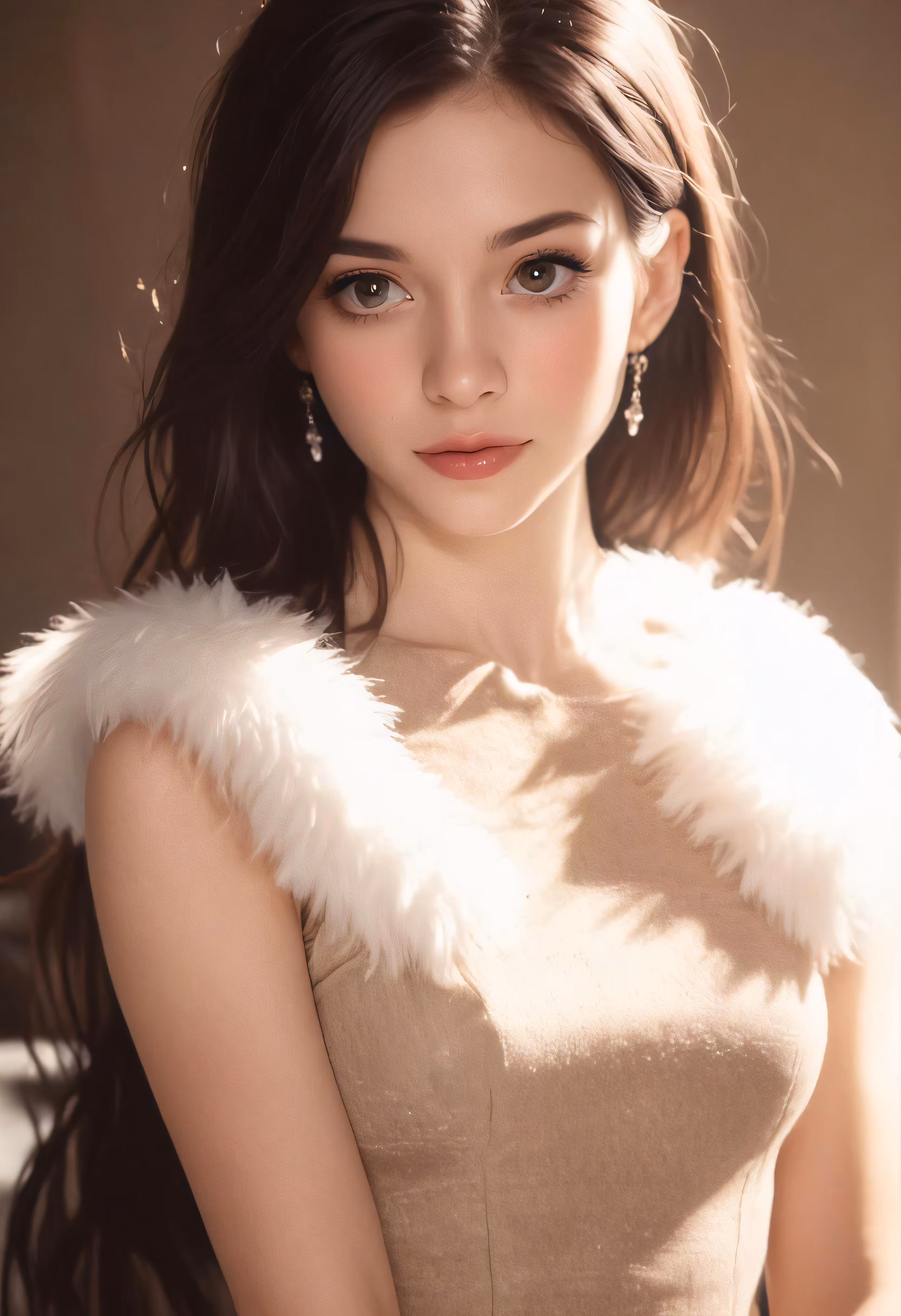 High resolution picture, free to use, a woman in a brown dress and white fur stole
