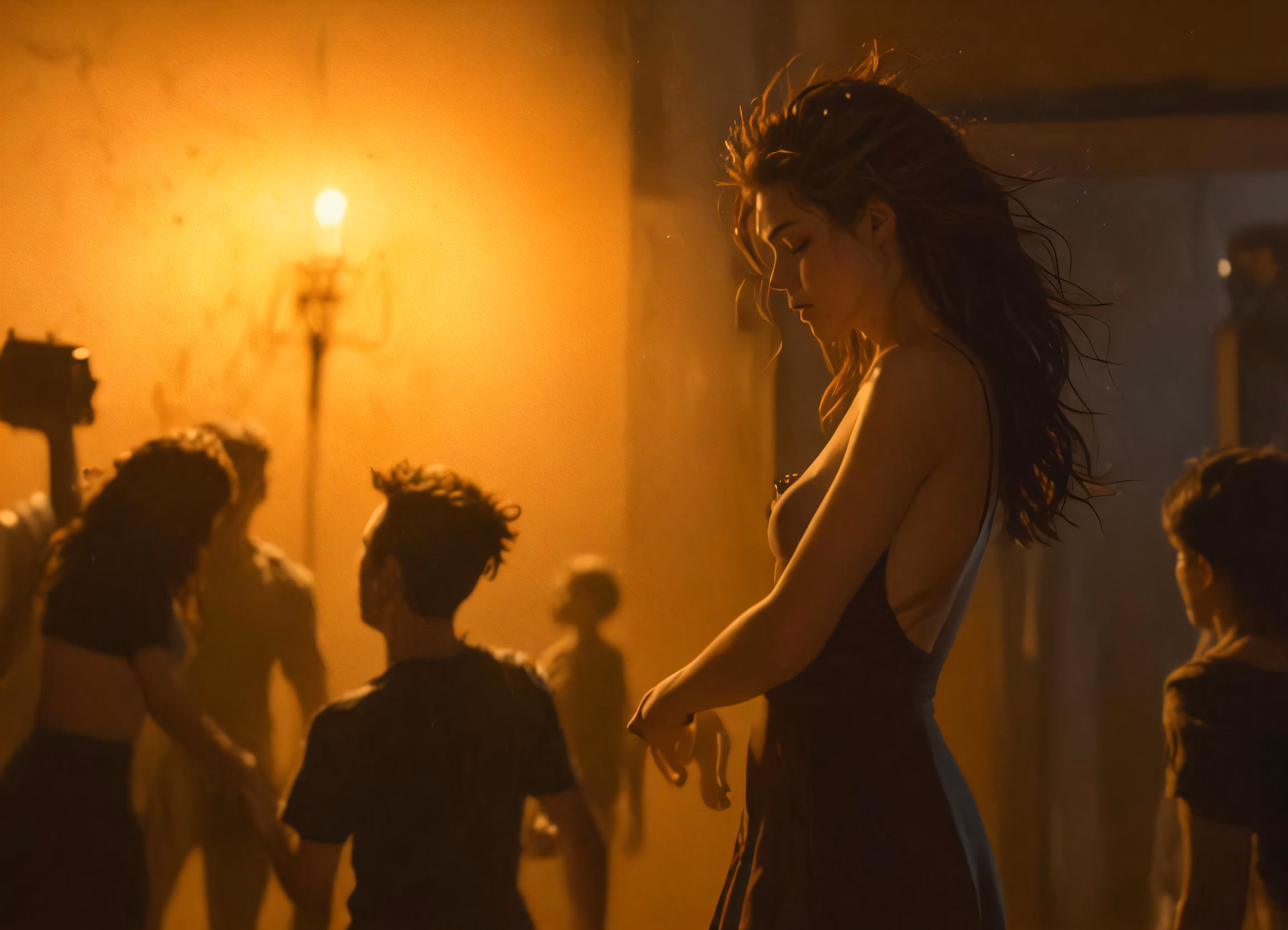 High resolution picture, free to use, a woman in a dark dress standing next to a crowd
