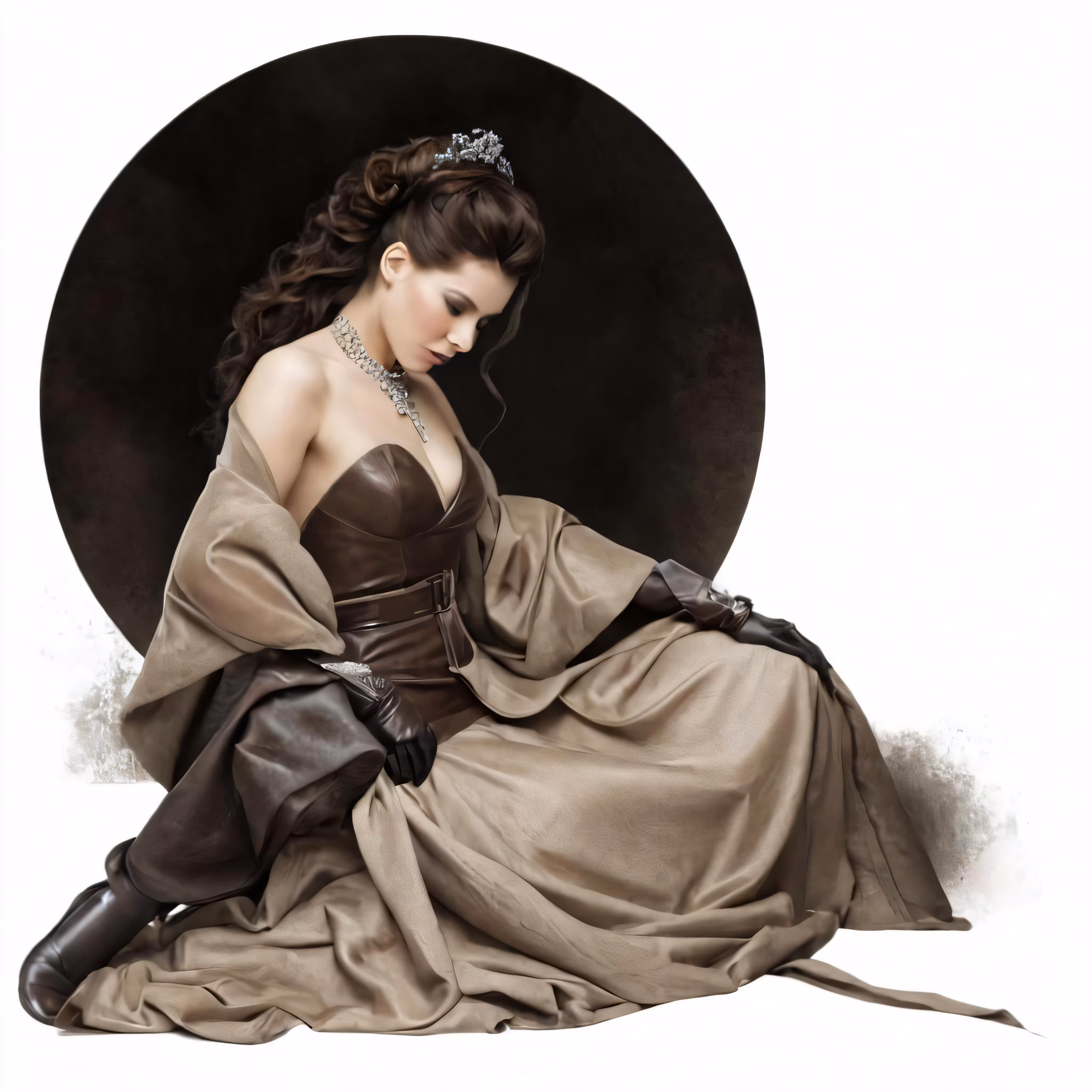 High resolution picture, free to use, a woman in a dress and cape sits with her hair in a bun and black gloves
