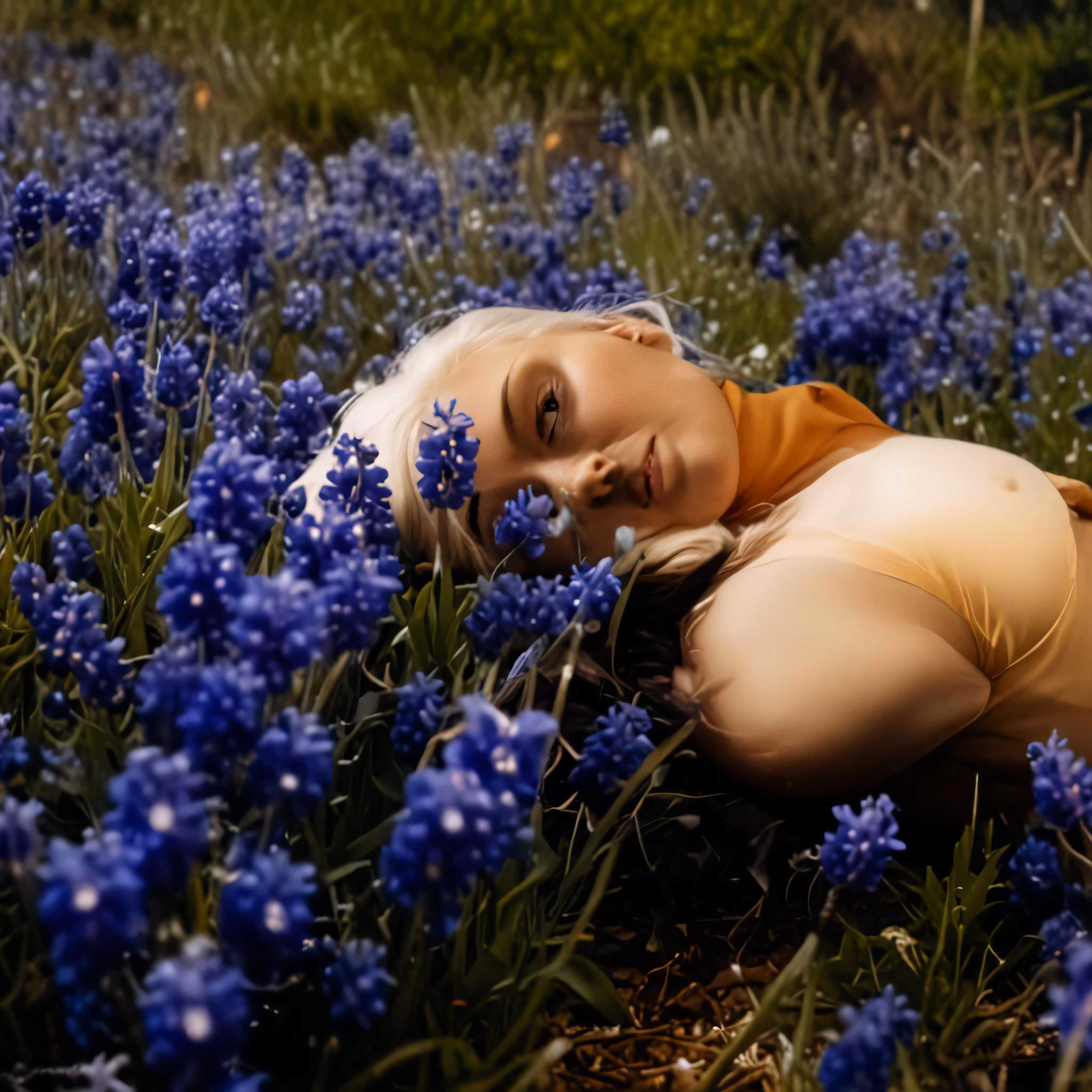High resolution picture, free to use, a woman in a field of flowers next to grass