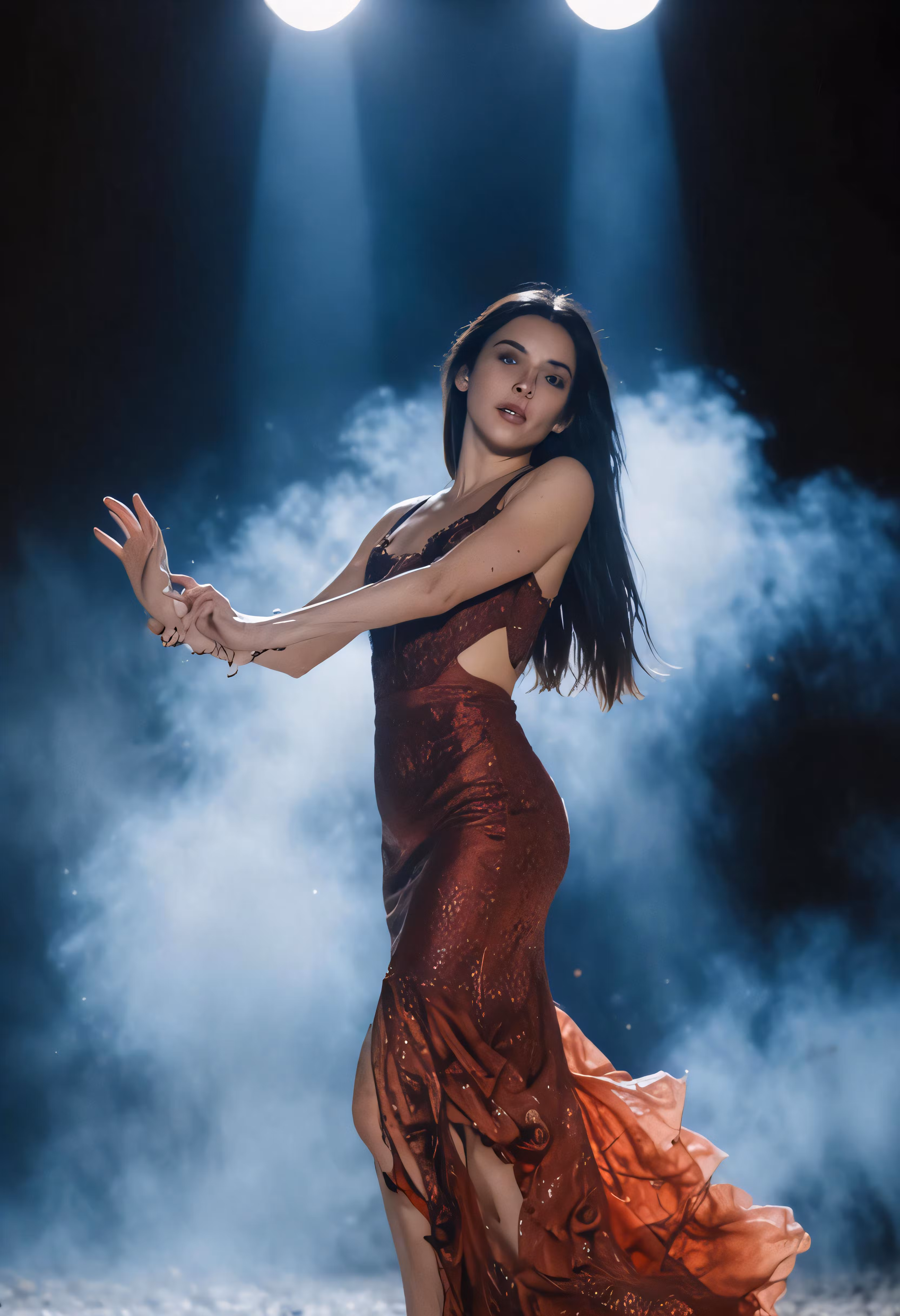 High resolution picture, free to use, a woman in a flowing red dress poses for a picture