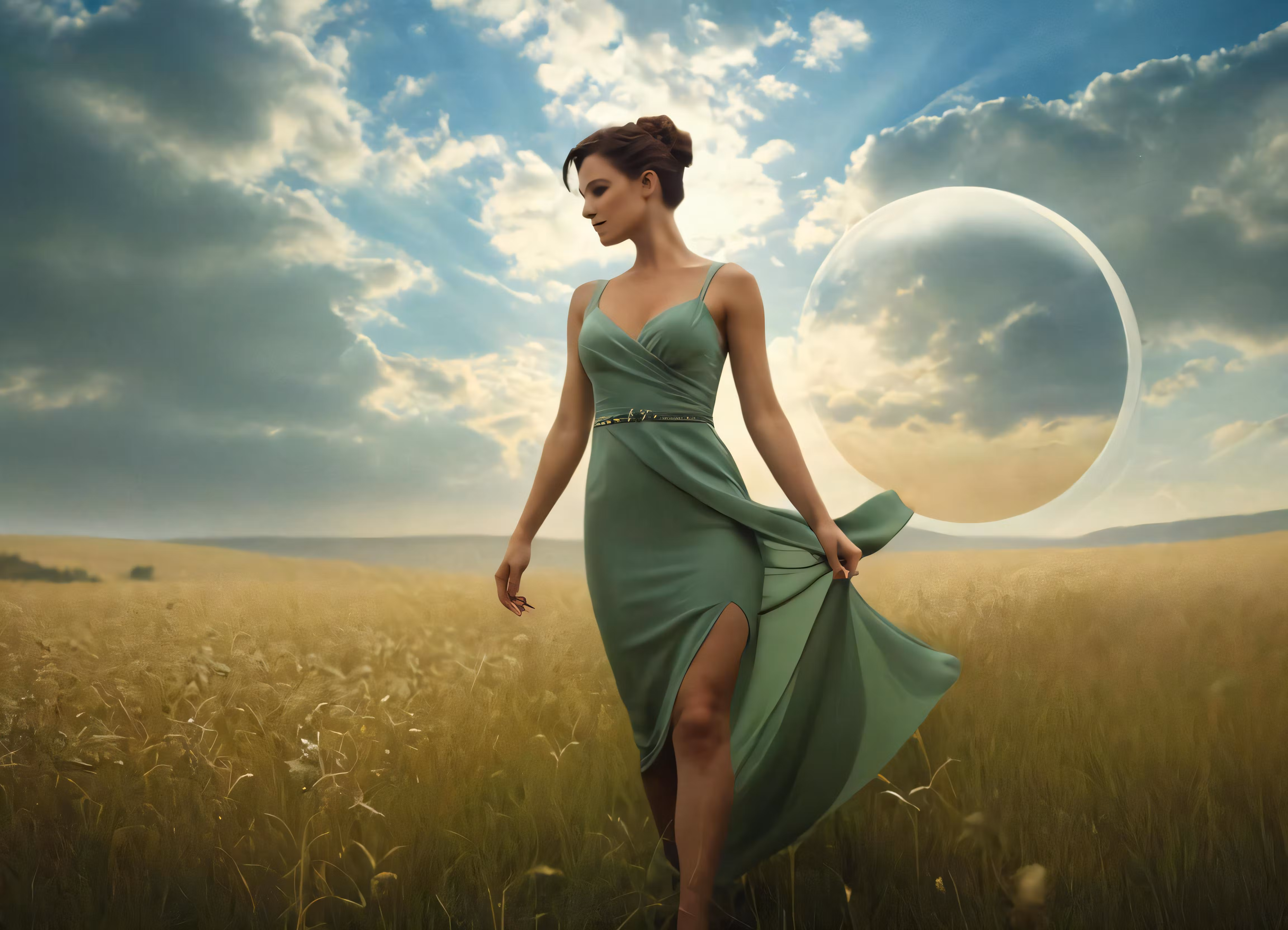 High resolution picture, free to use, a woman in a green dress is walking through the grass