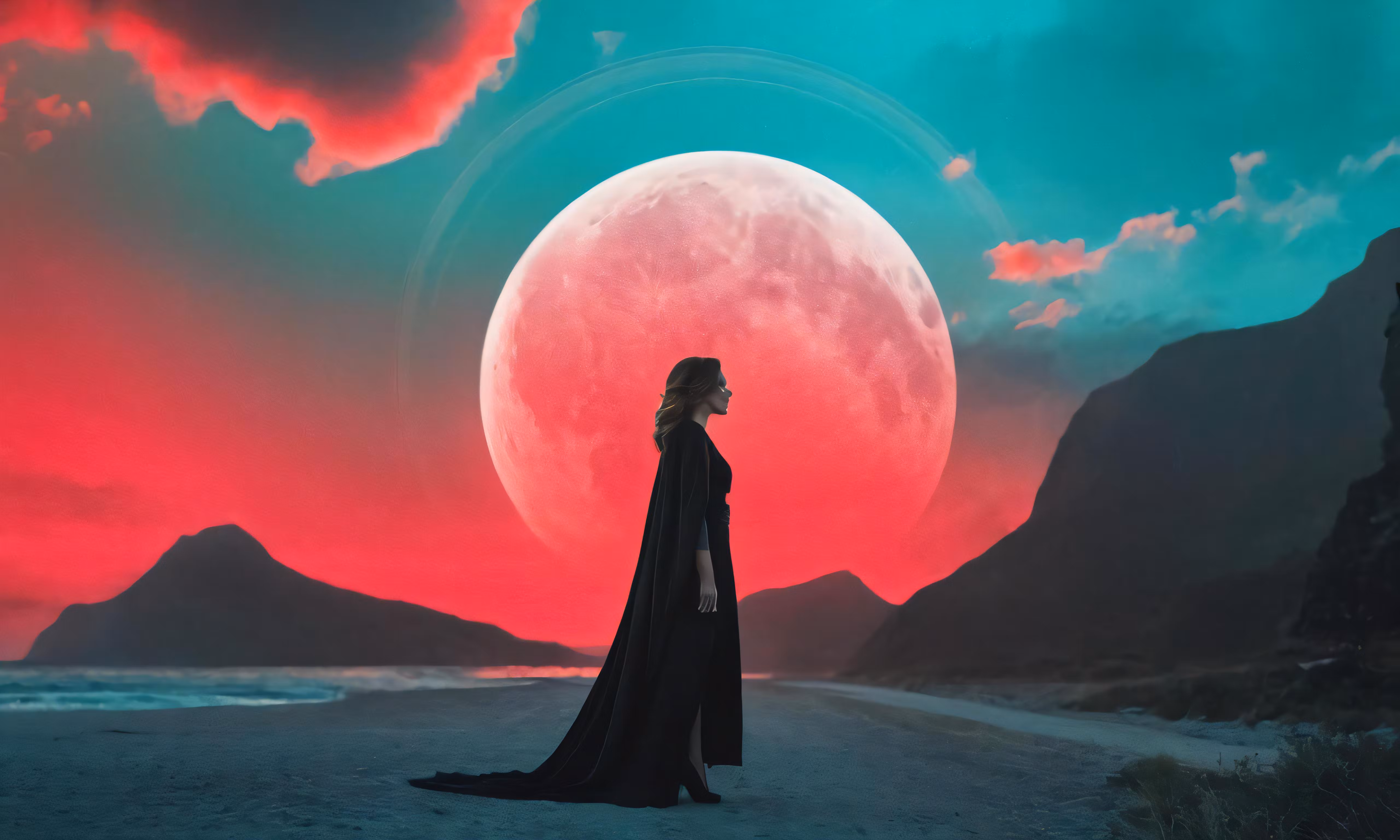 High resolution picture, free to use, a woman in a long black dress walks across a desert with mountains behind her as the sun sets