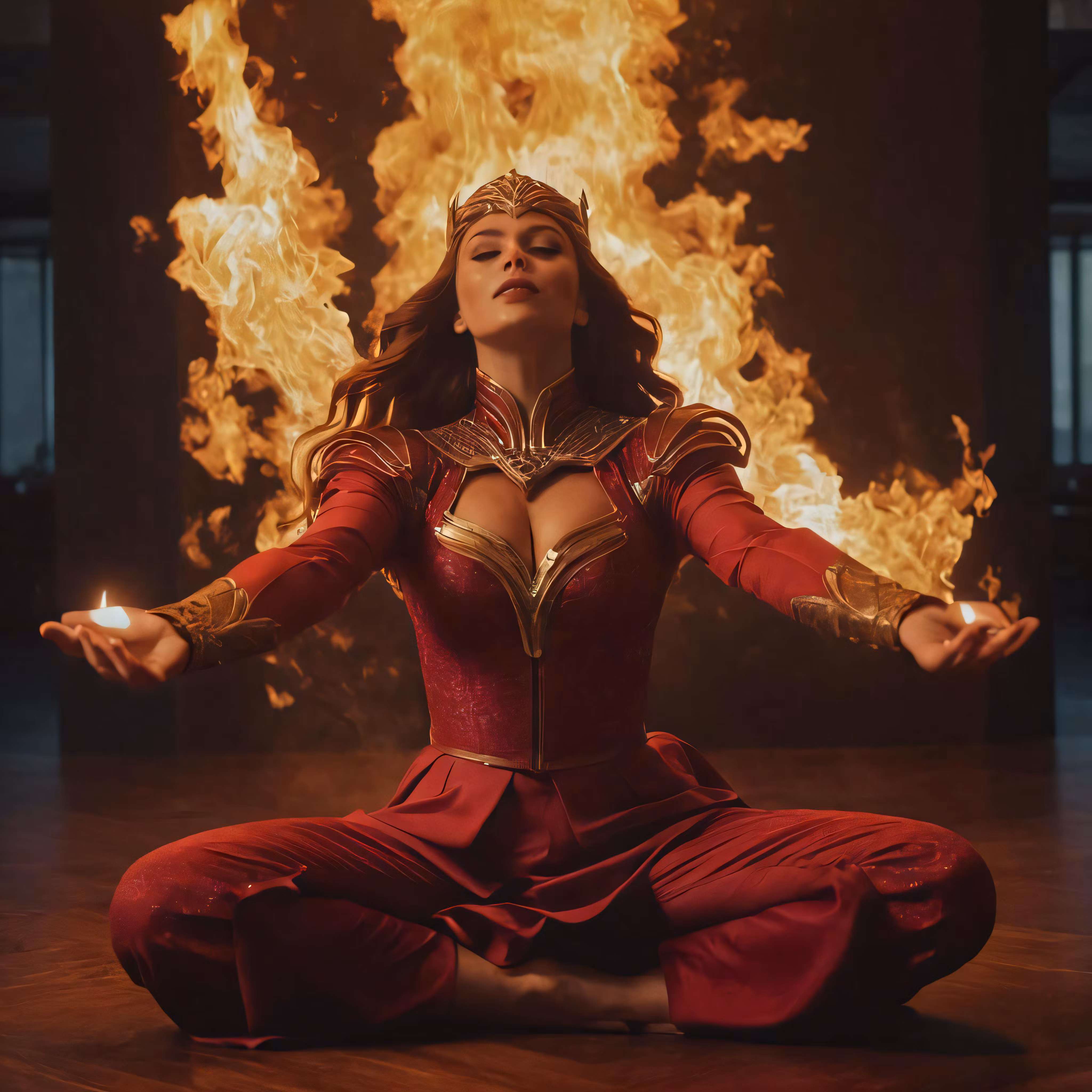 High resolution picture, free to use, a woman in a red dress is sitting on the floor and meditating with fire