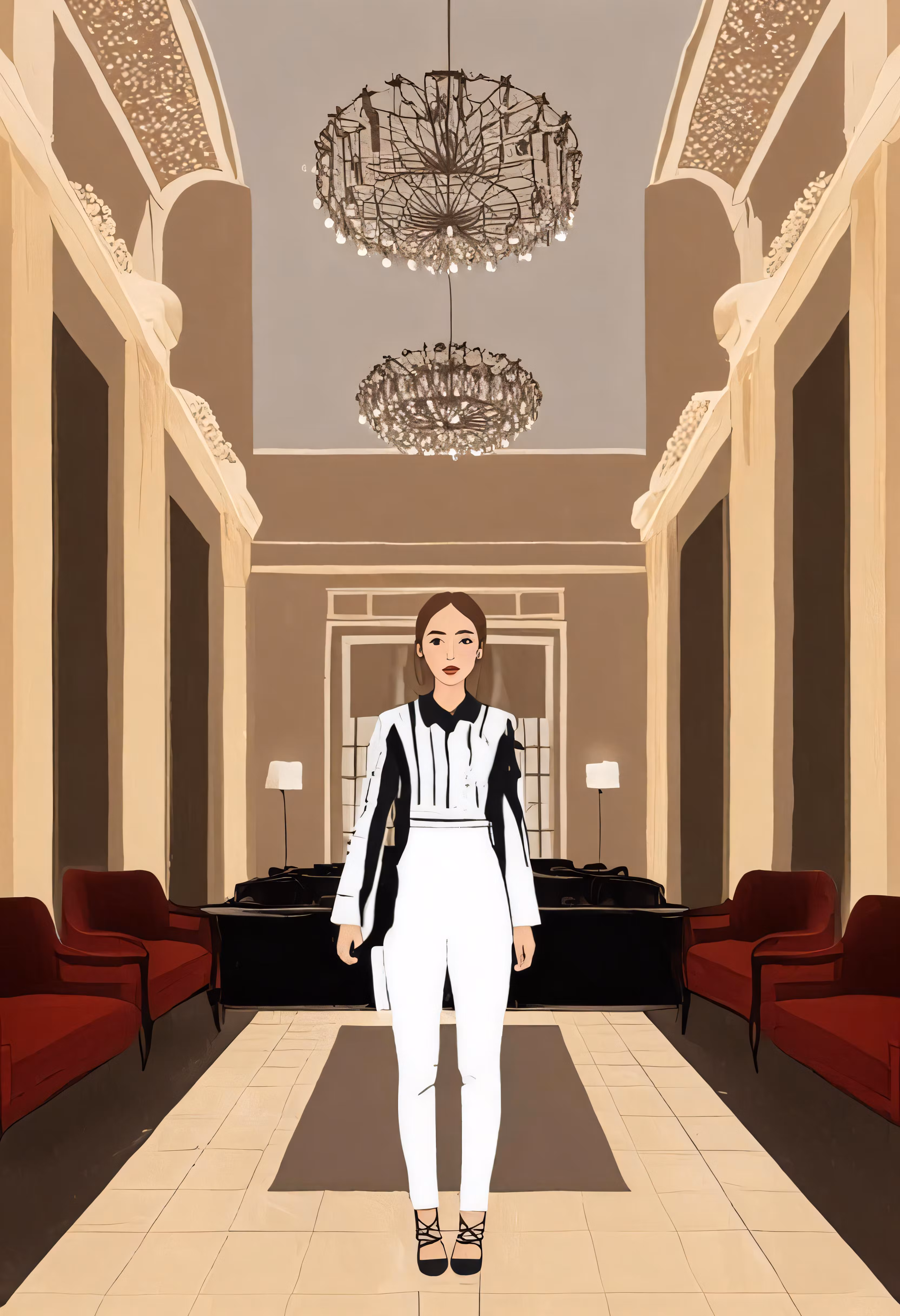 High resolution picture, free to use, a woman in a room with chandeliers on the ceiling