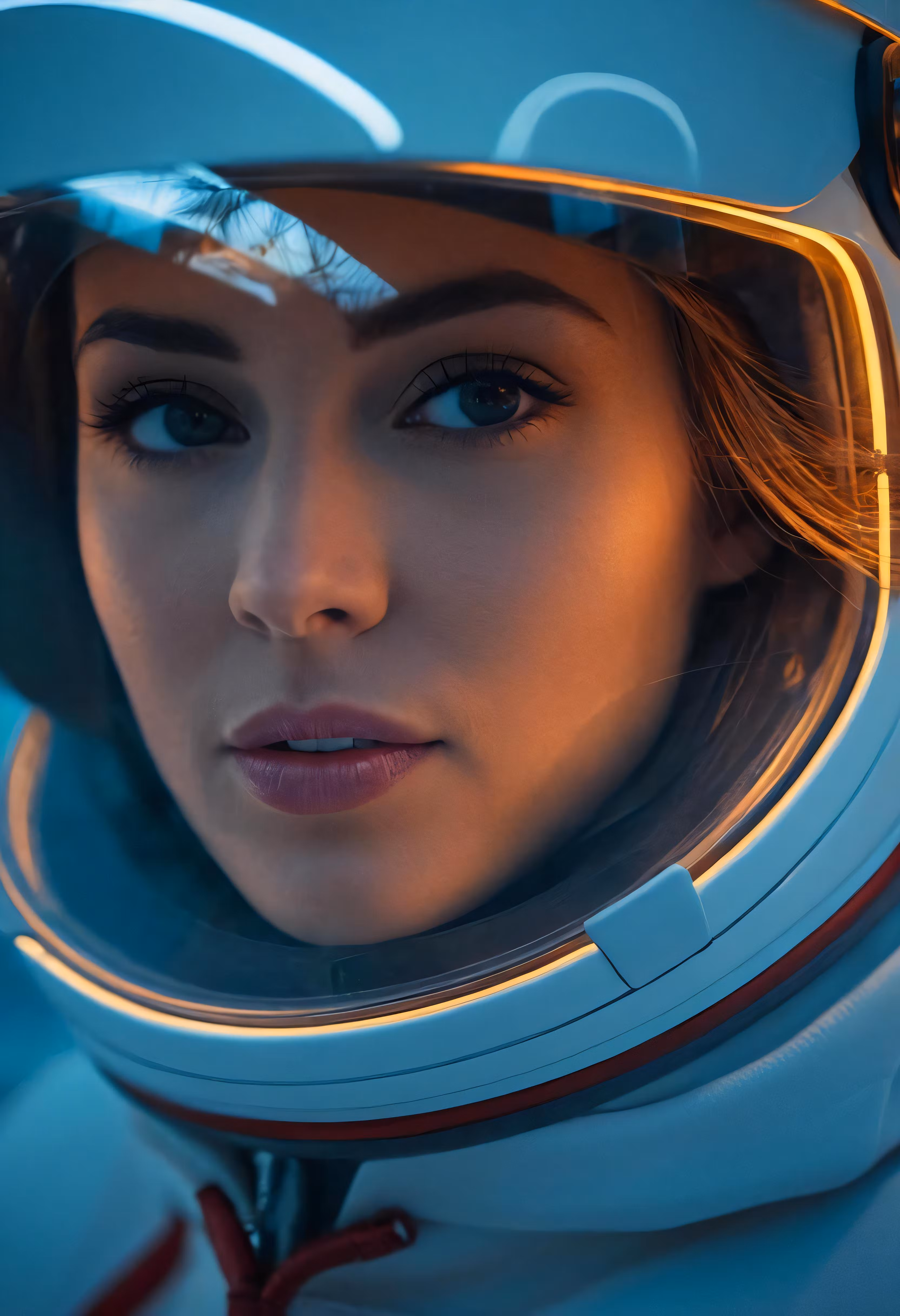 High resolution picture, free to use, a woman in a spacesuit looks into the distance