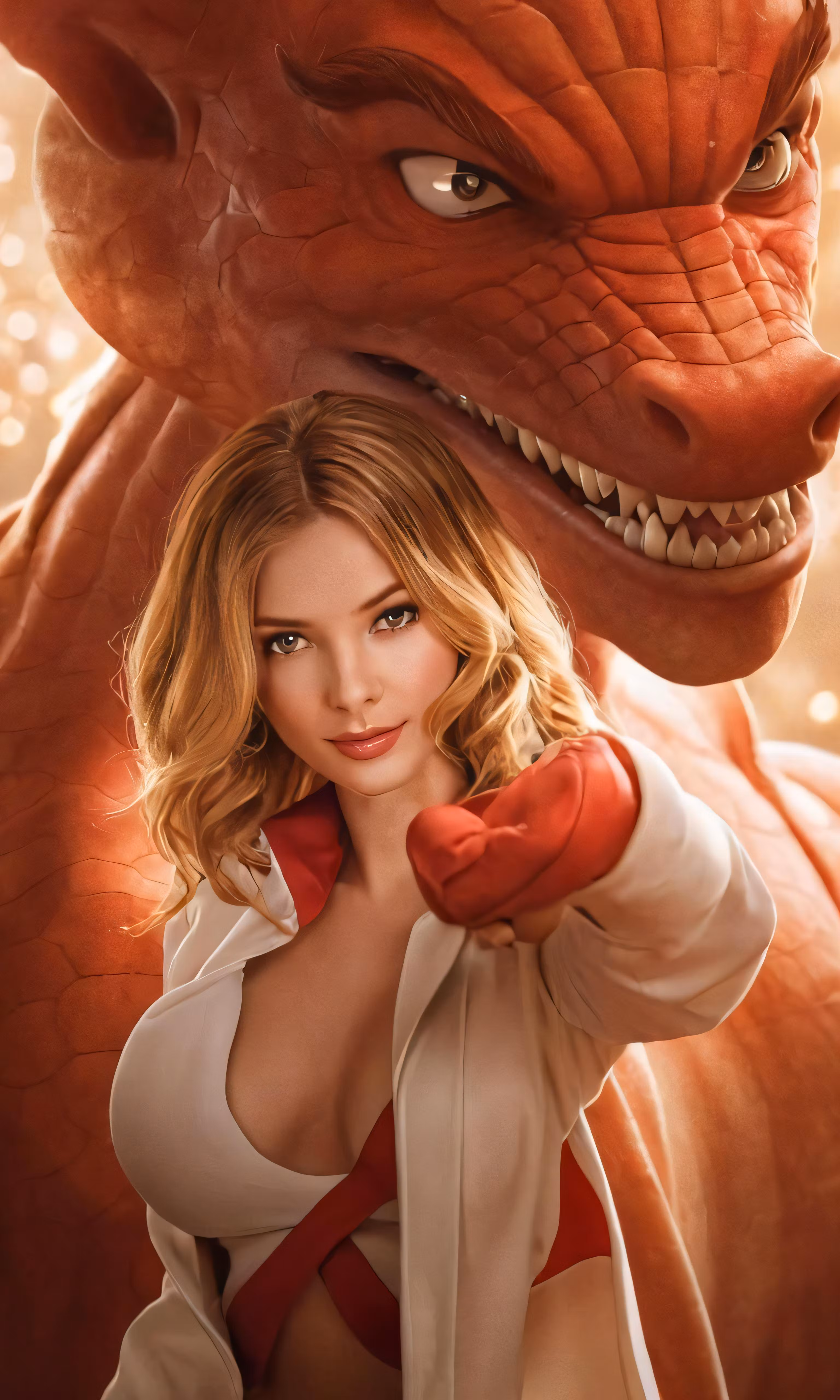High resolution picture, free to use, a woman in a white jacket pointing at an orange dragon