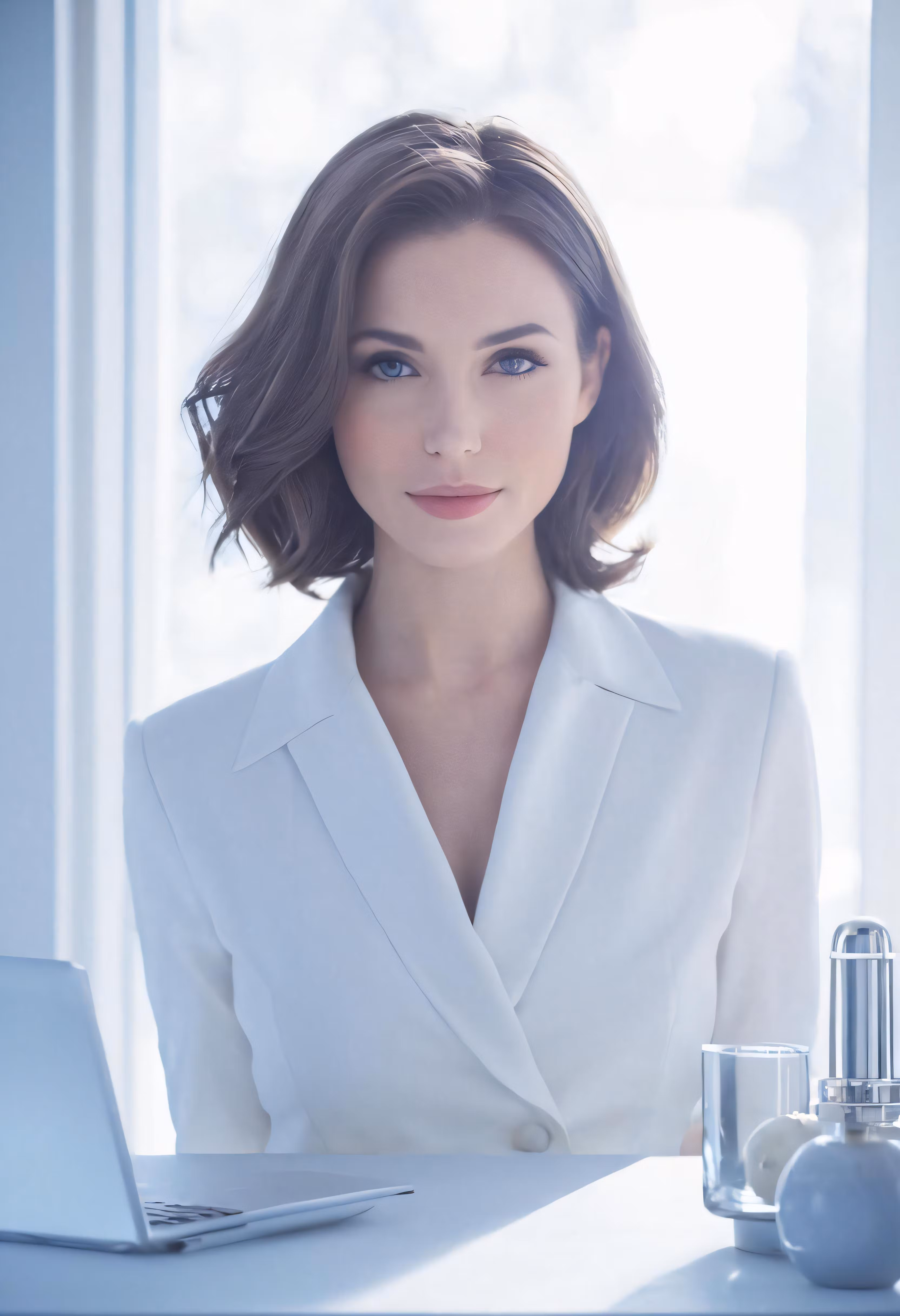 High resolution picture, free to use, a woman in a white suit and with a glass