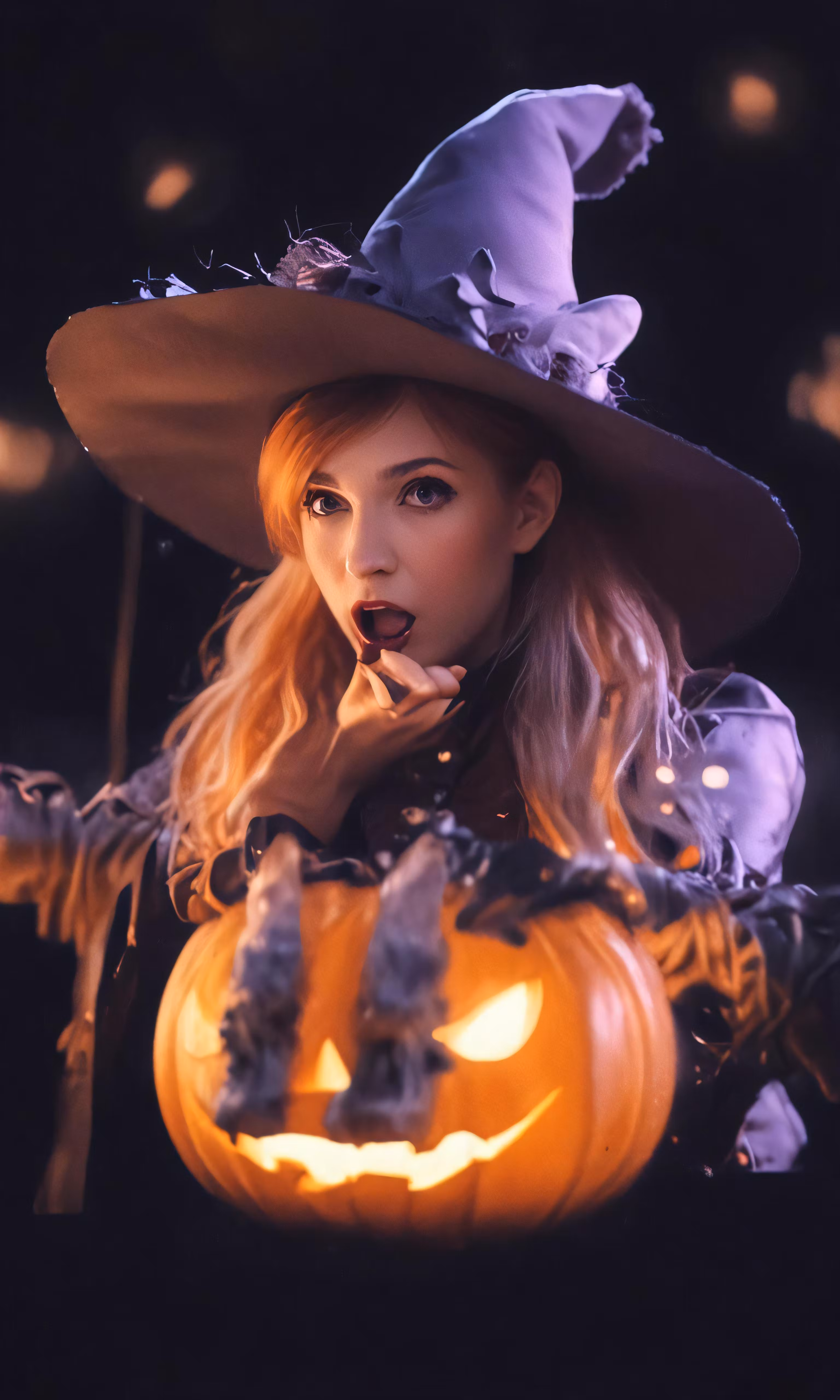 High resolution picture, free to use, a woman in a witch costume posing with her pumpkin