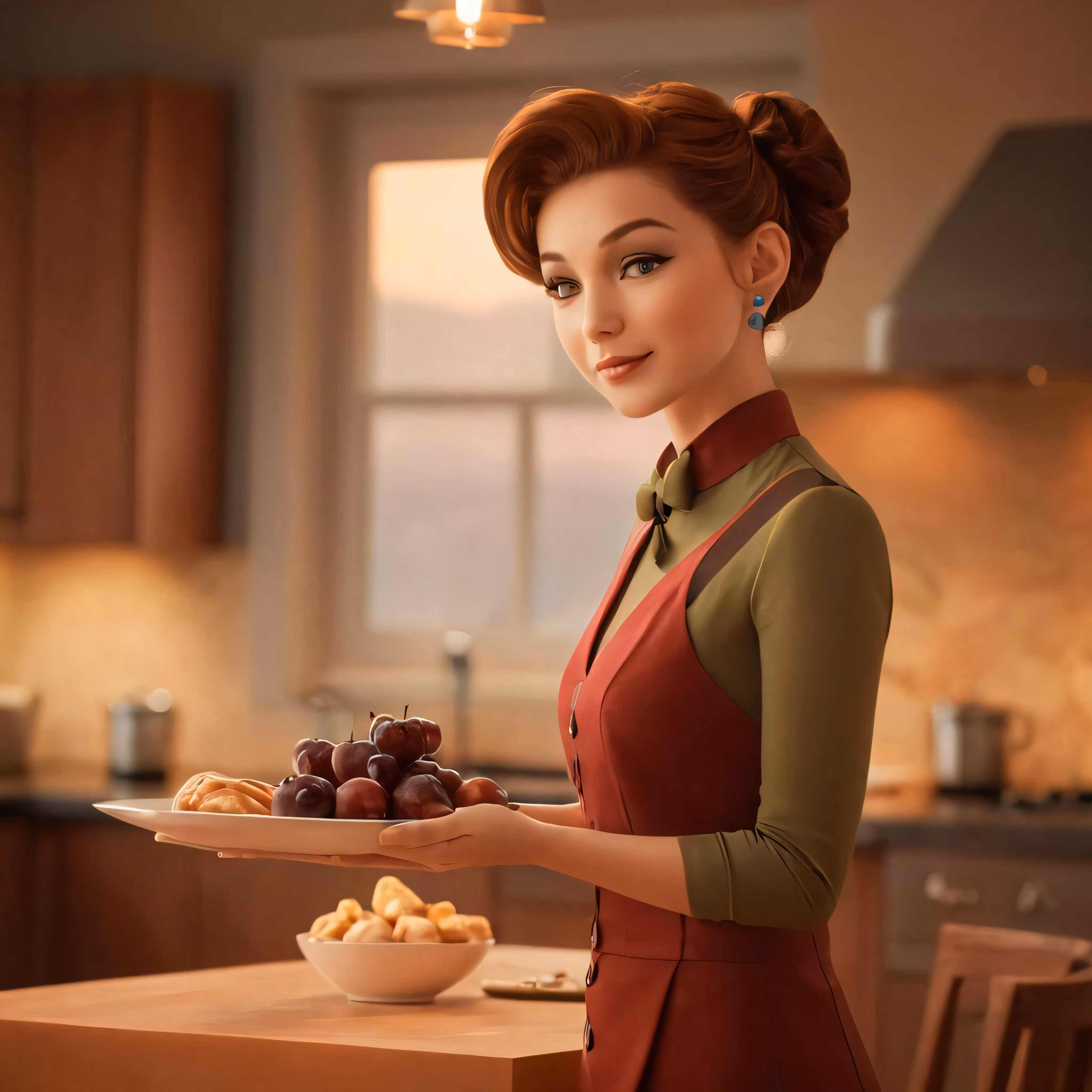 High resolution picture, free to use, a woman in an old time kitchen holds a platter of food