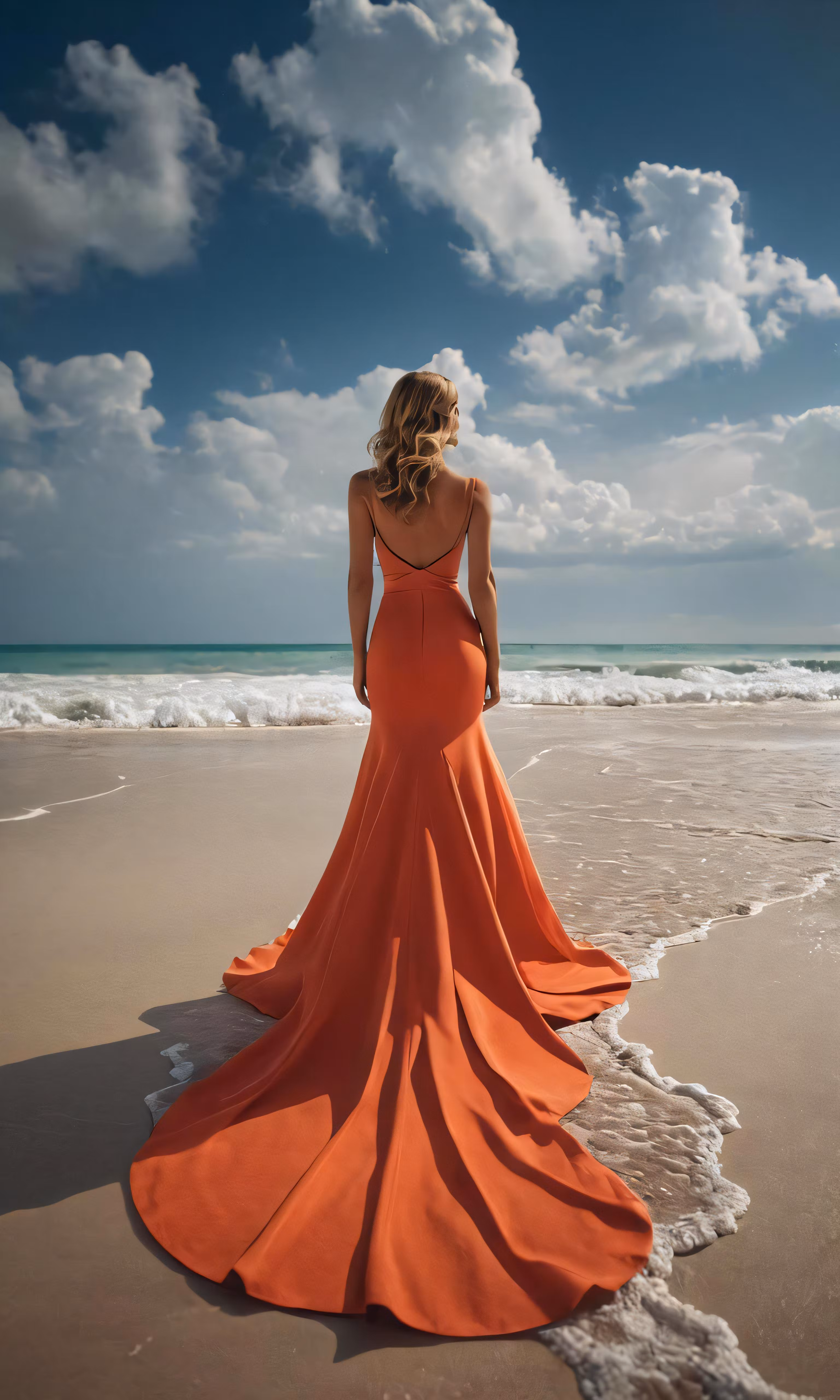 High resolution picture, free to use, a woman in an orange dress standing on the beach