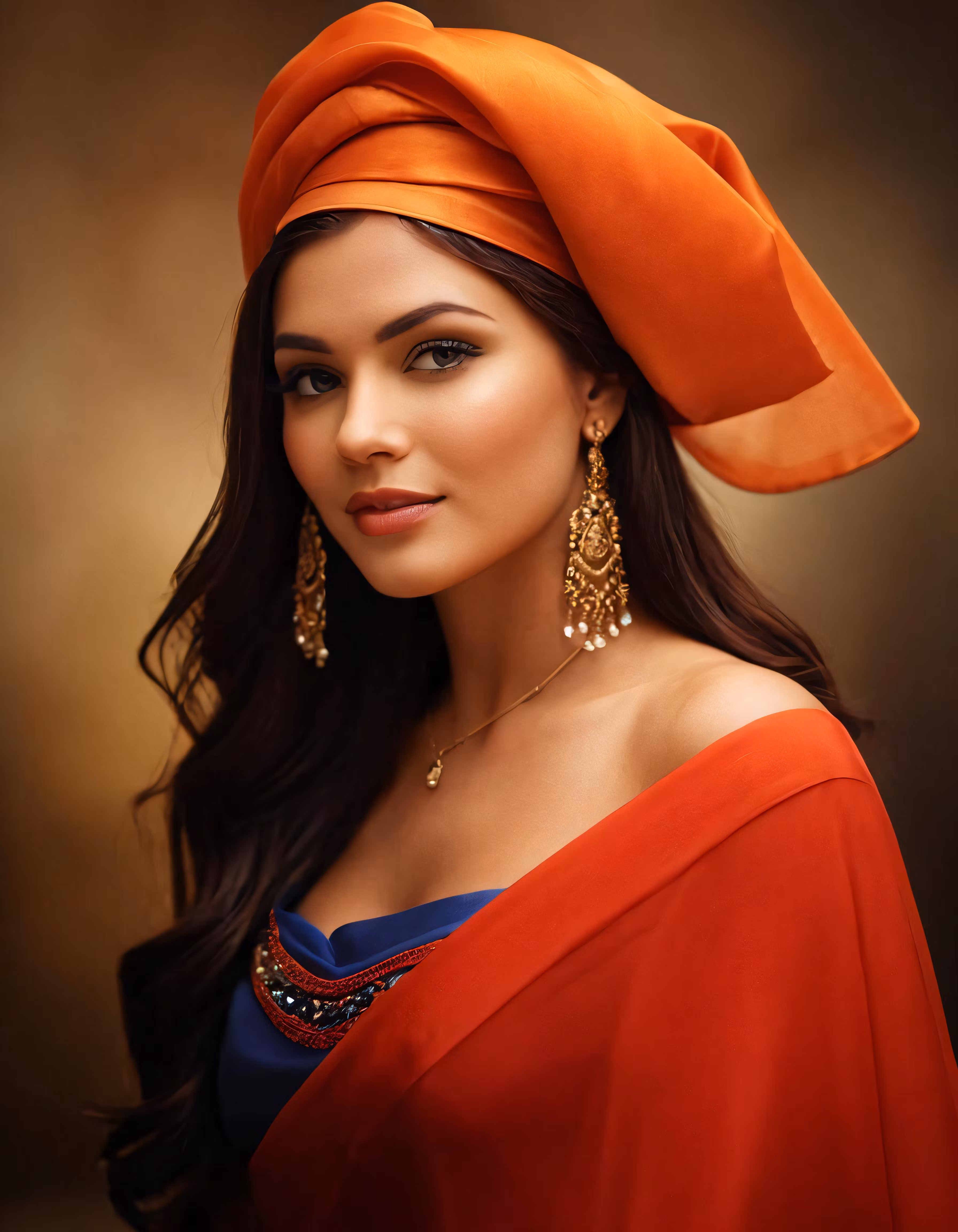 High resolution picture, free to use, a woman in an orange scarf and a hat