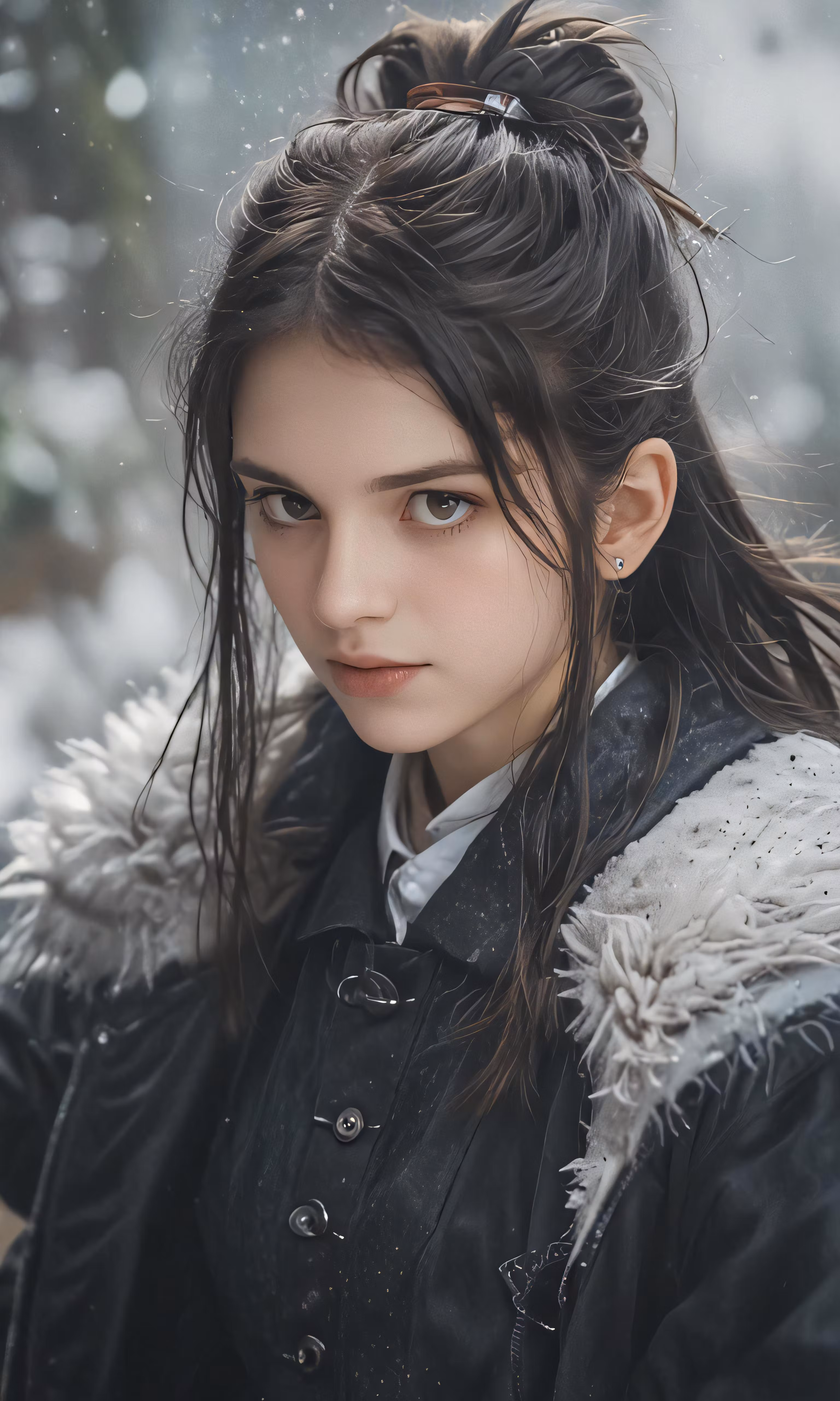 High resolution picture, free to use, a woman in black leather jacket walking through snow