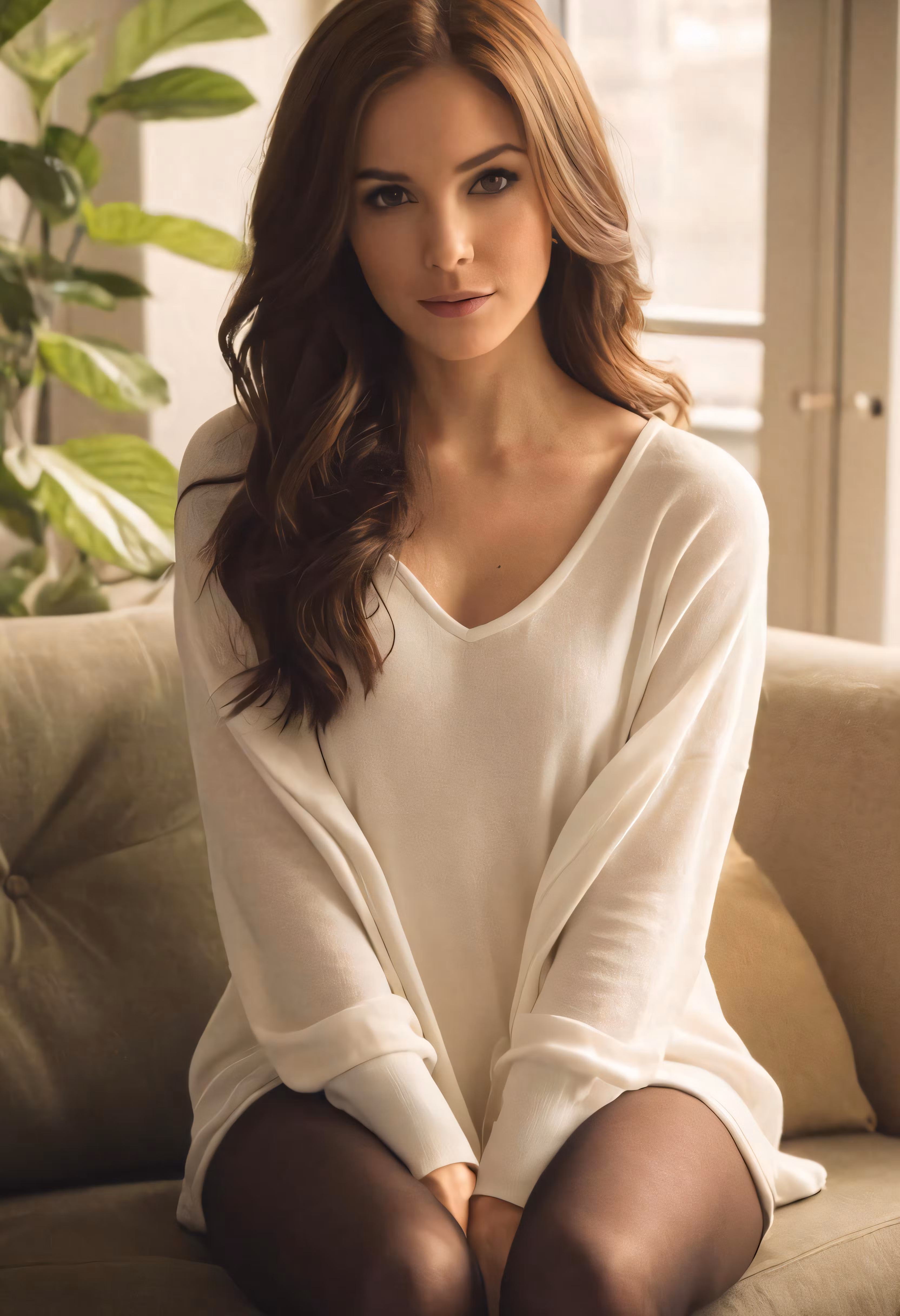 High resolution picture, free to use, a woman in black stockings and a white top sits on a couch