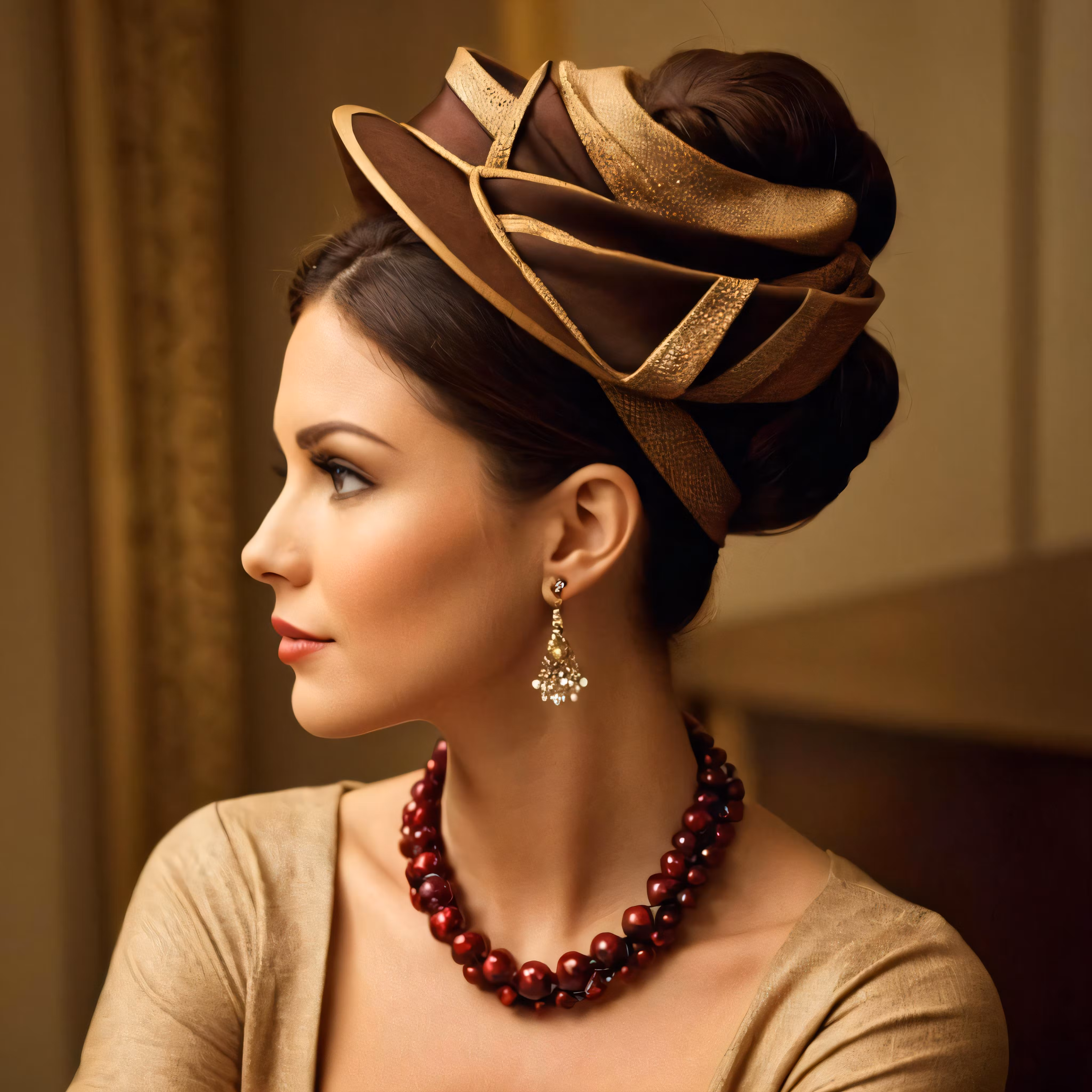 High resolution picture, free to use, a woman in brown clothes and a necklace