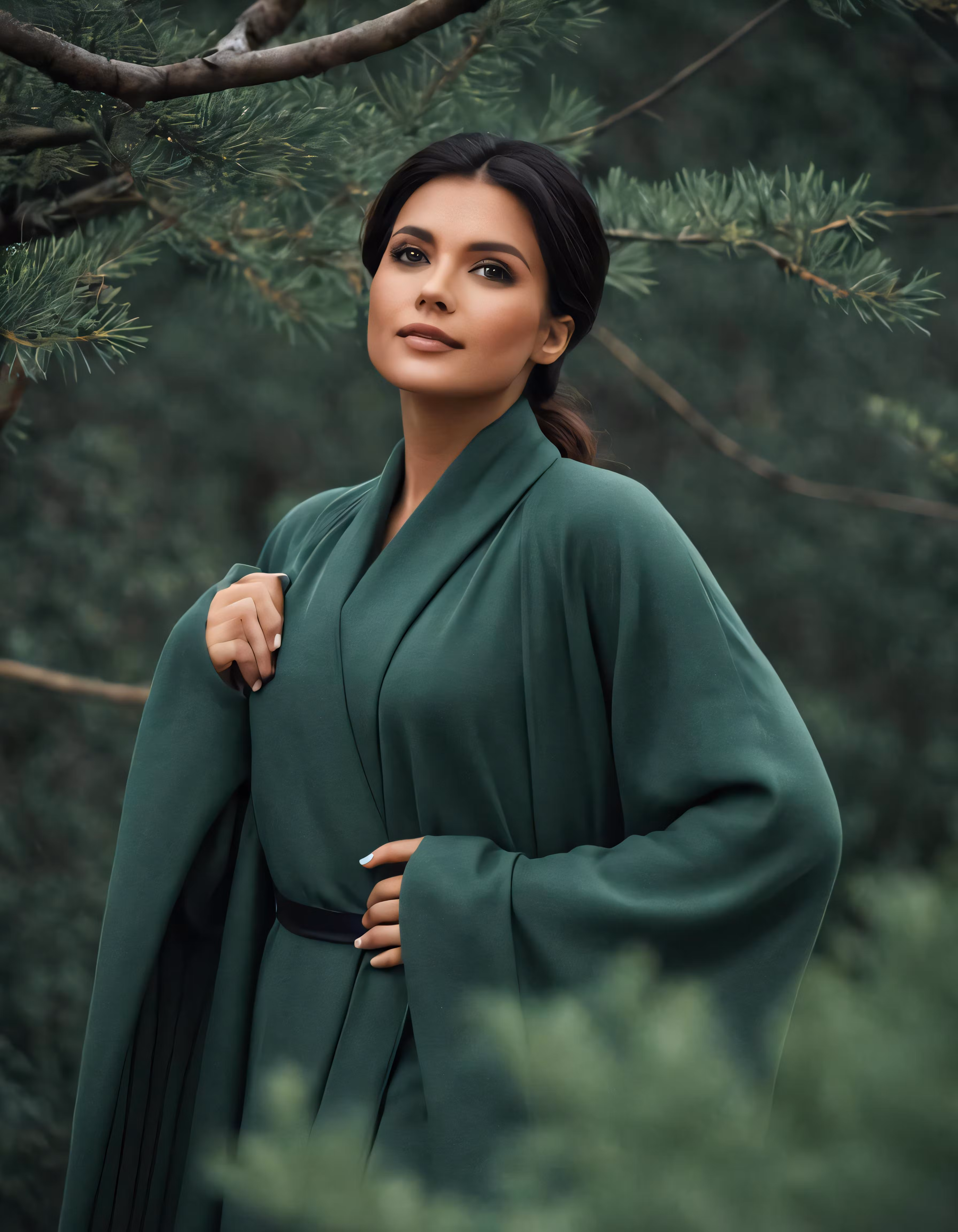 High resolution picture, free to use, a woman in green poses for a photo in front of a tree