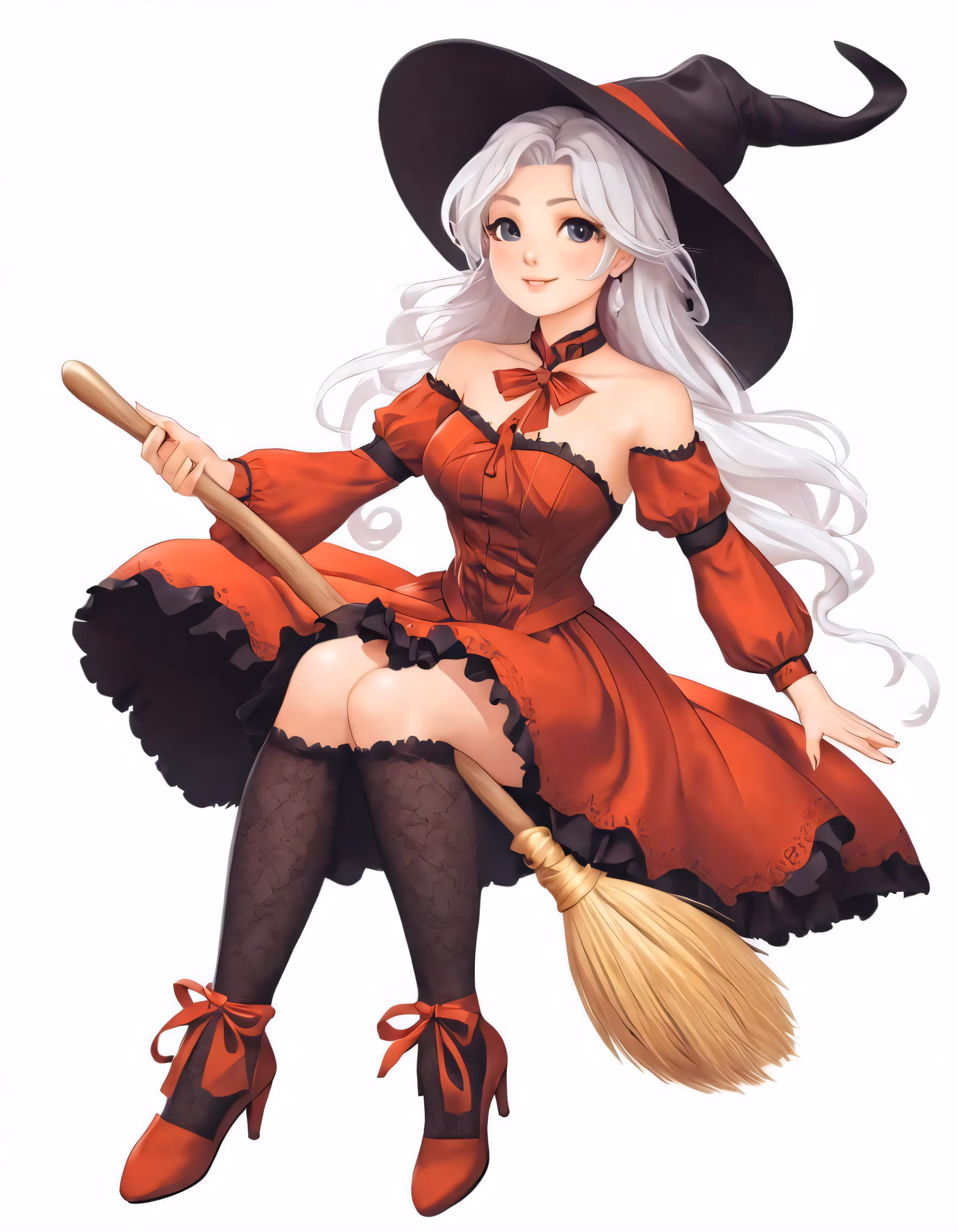 High resolution picture, free to use, a woman in red dress and witch hat sitting on a broom