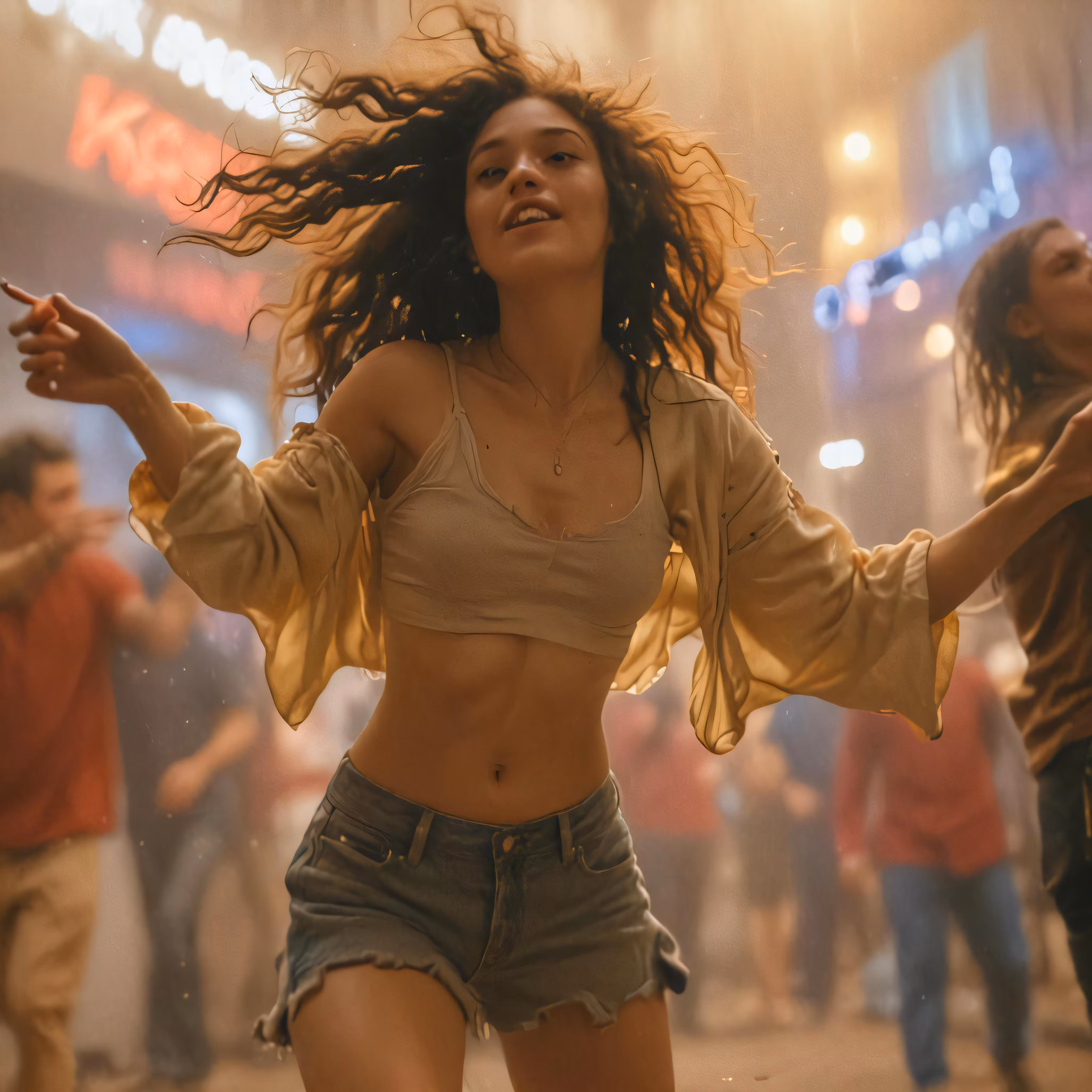 High resolution picture, free to use, a woman in short shorts is dancing on the street