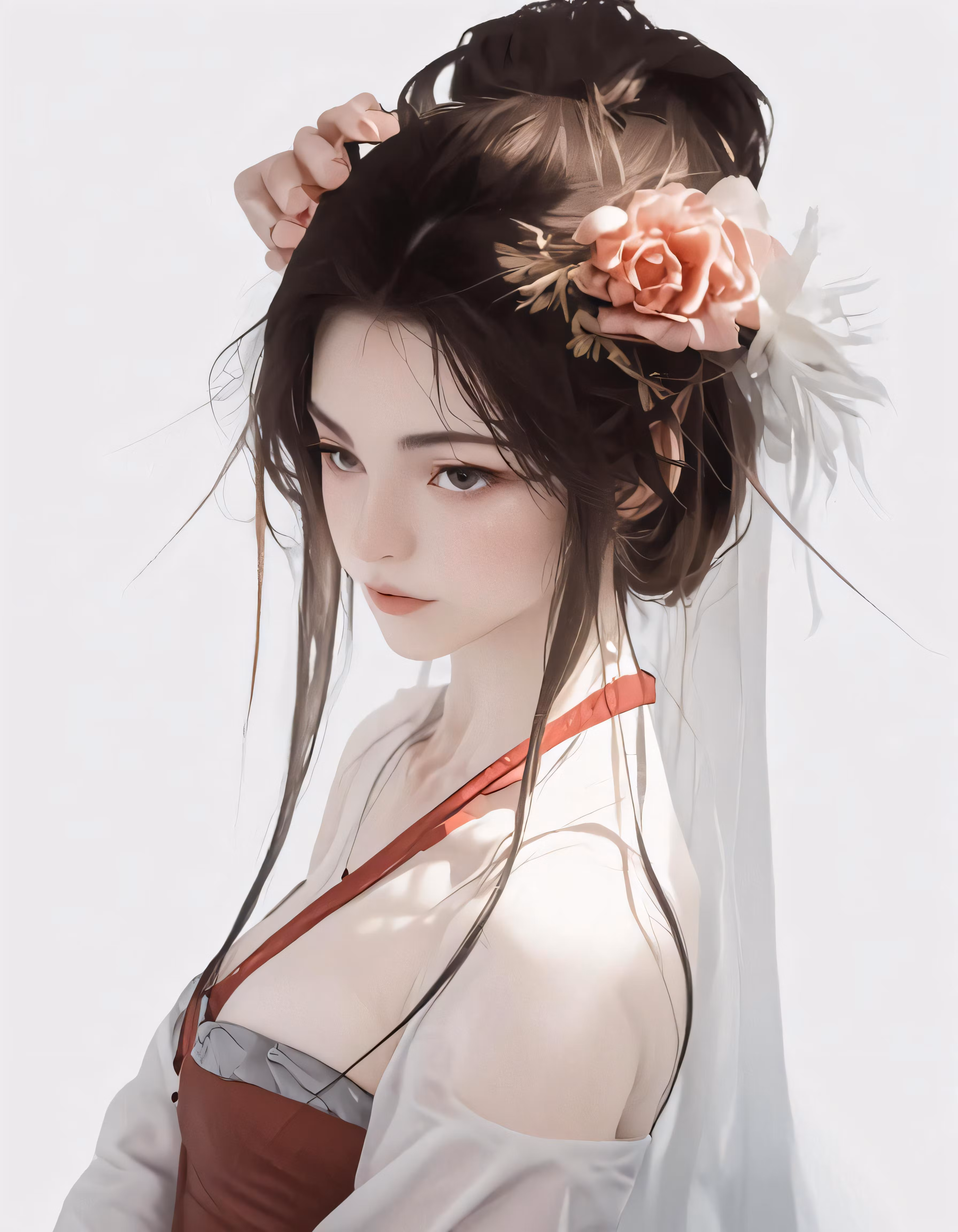 High resolution picture, free to use, a woman in white dress and a flower in her hair