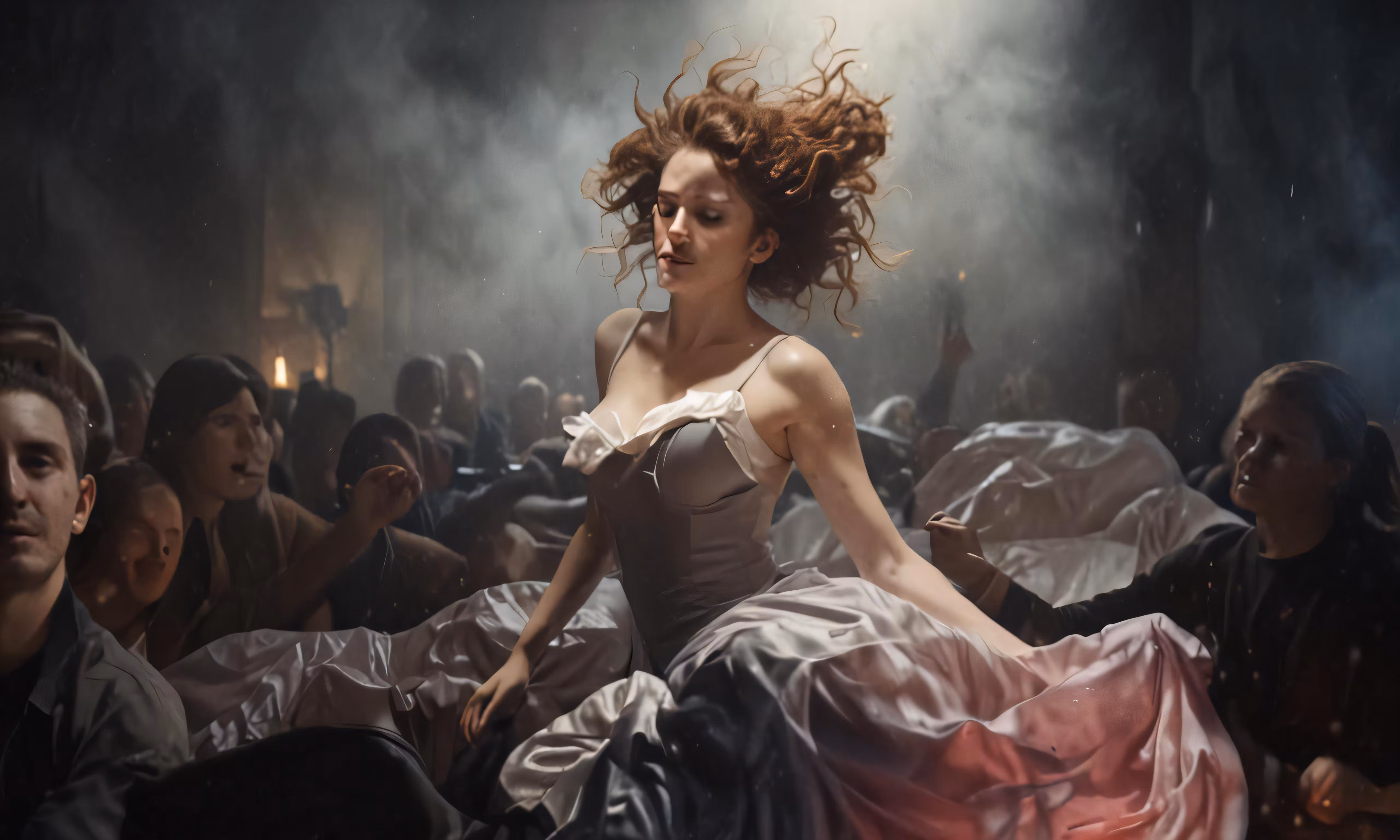 High resolution picture, free to use, a woman in white is sitting in front of a group of people