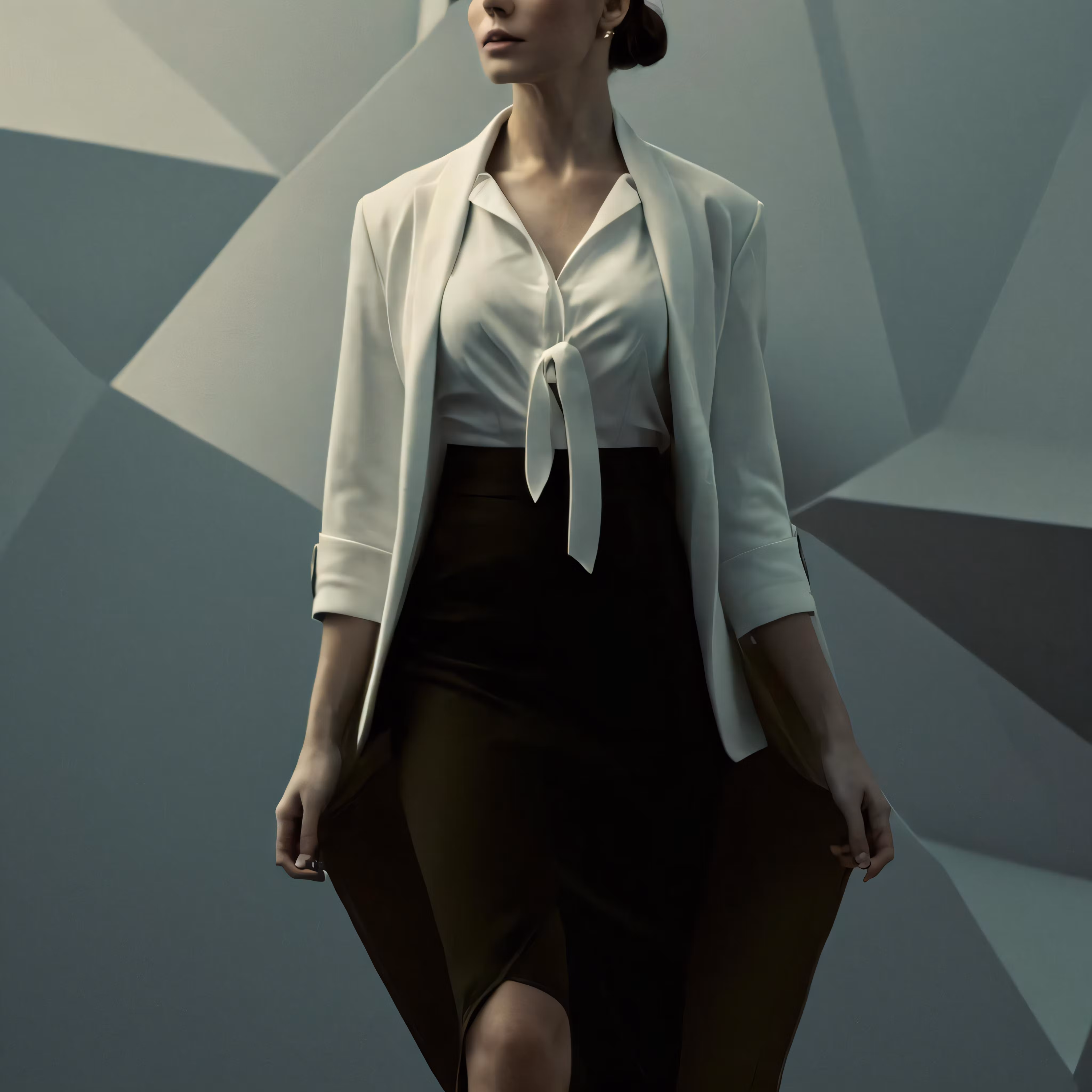 High resolution picture, free to use, a woman in white shirt and black skirt walking down the runway