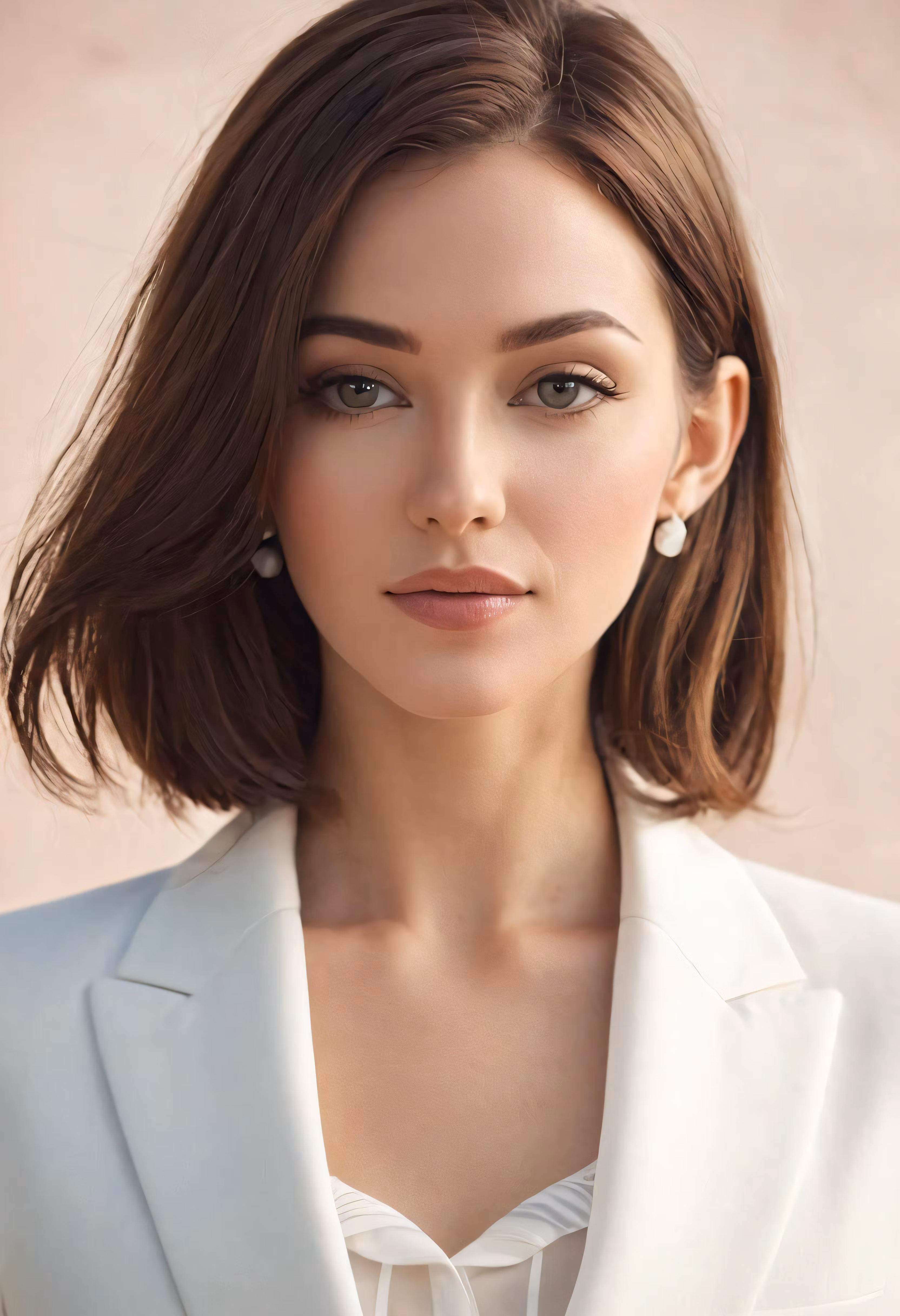 High resolution picture, free to use, a woman in white suit jacket and earrings looking directly at the camera