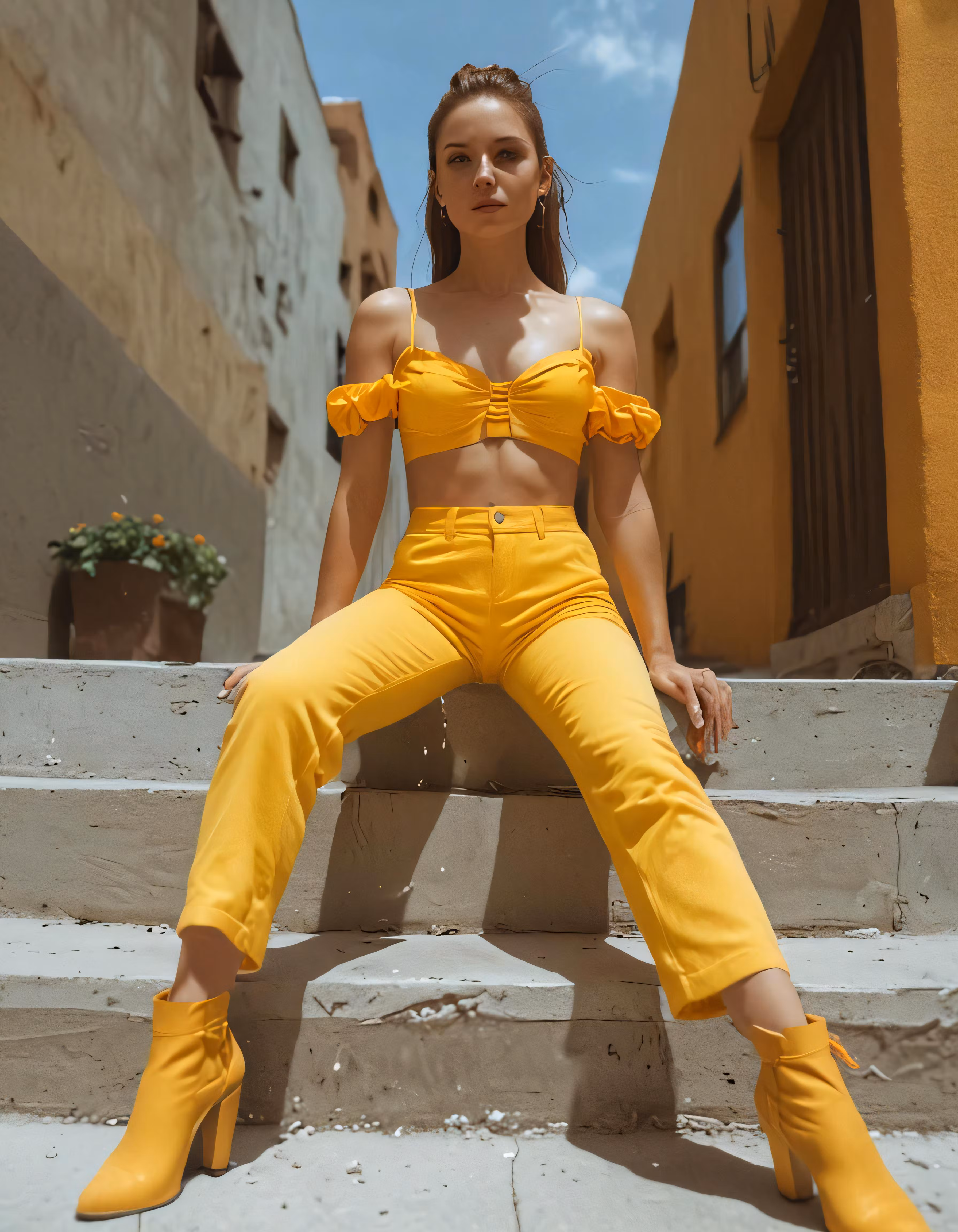 High resolution picture, free to use, a woman in yellow pants sitting on the steps