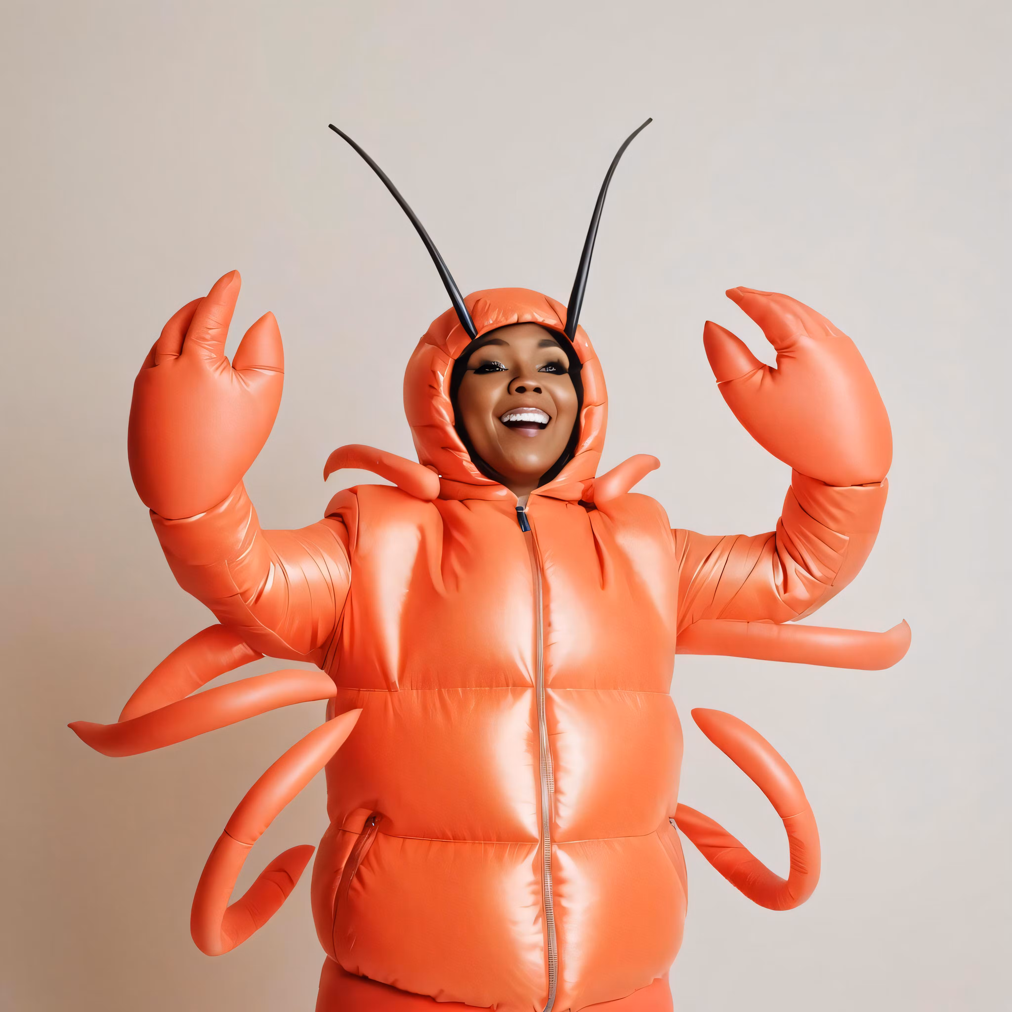 High resolution picture, free to use, a woman is dressed in an orange lobster costume