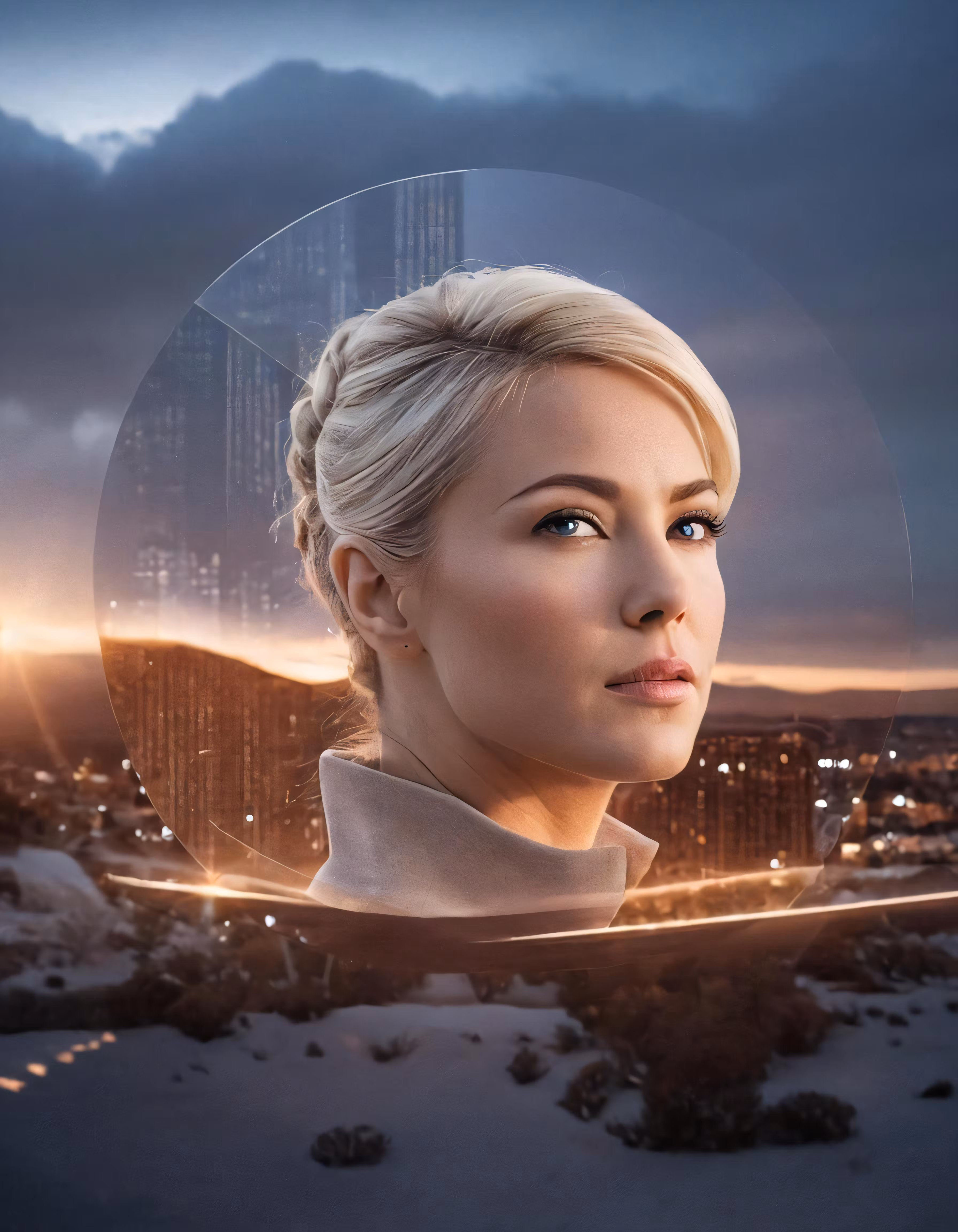 High resolution picture, free to use, a woman is in the middle of a futuristic landscape