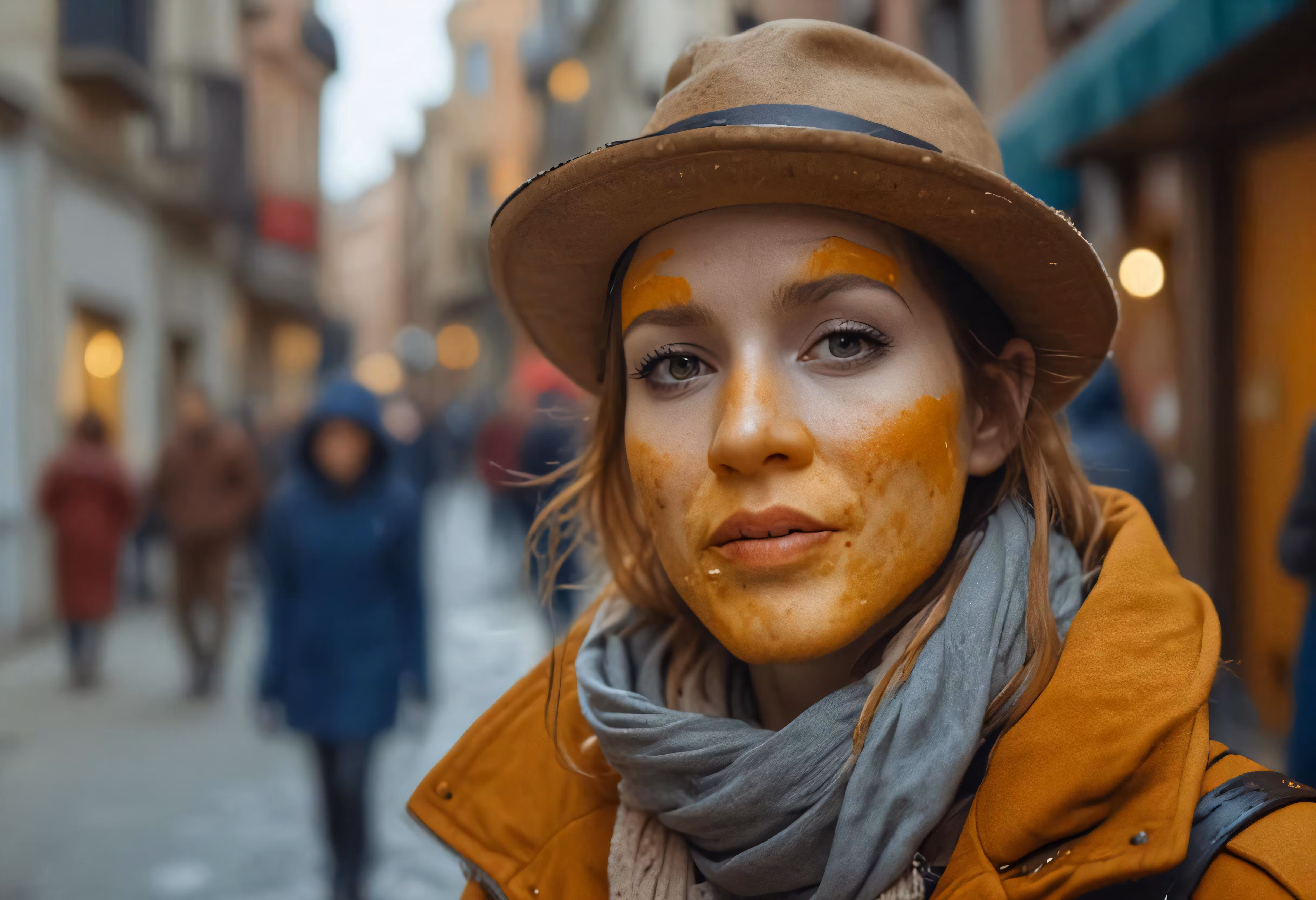 High resolution picture, free to use, a woman is on the street with face paint on