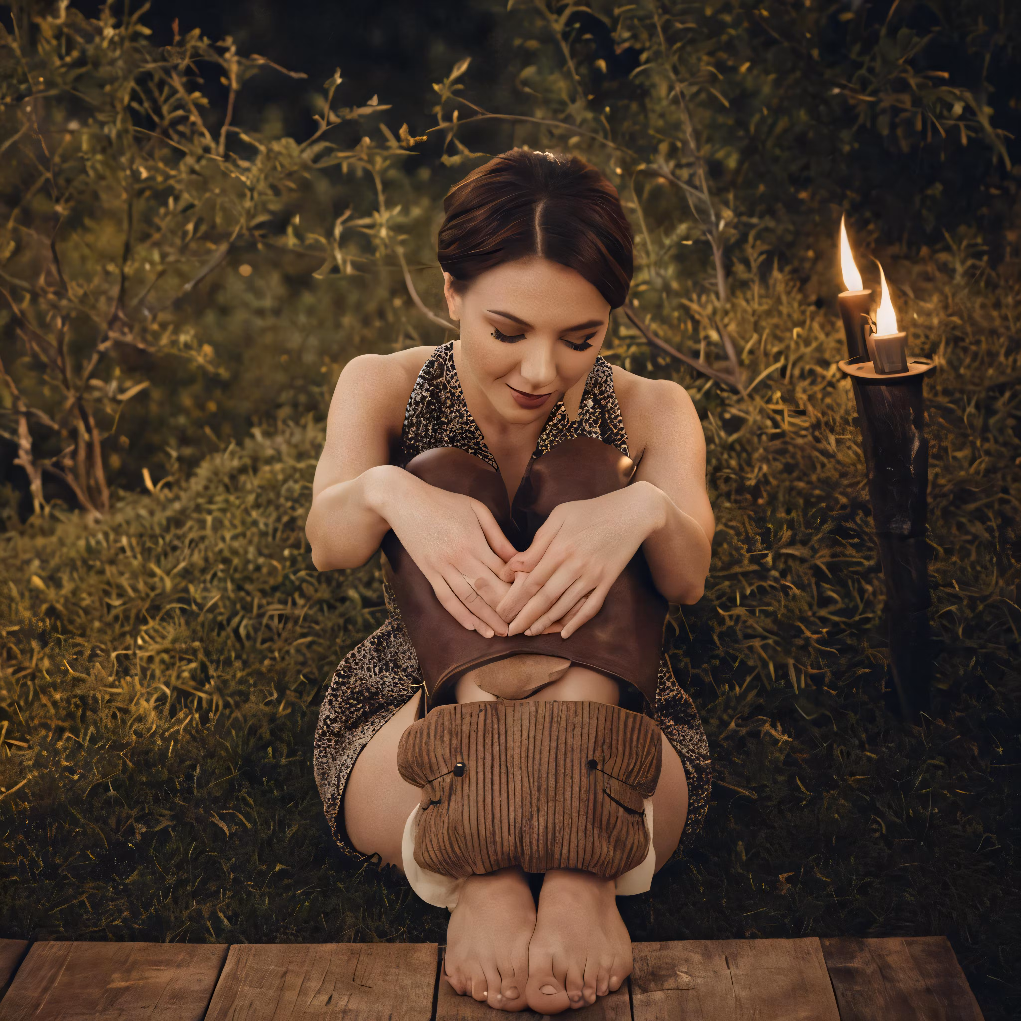 High resolution picture, free to use, a woman is sitting on a wooden platform in the woods, holding her hands to her knees with a candle in the background