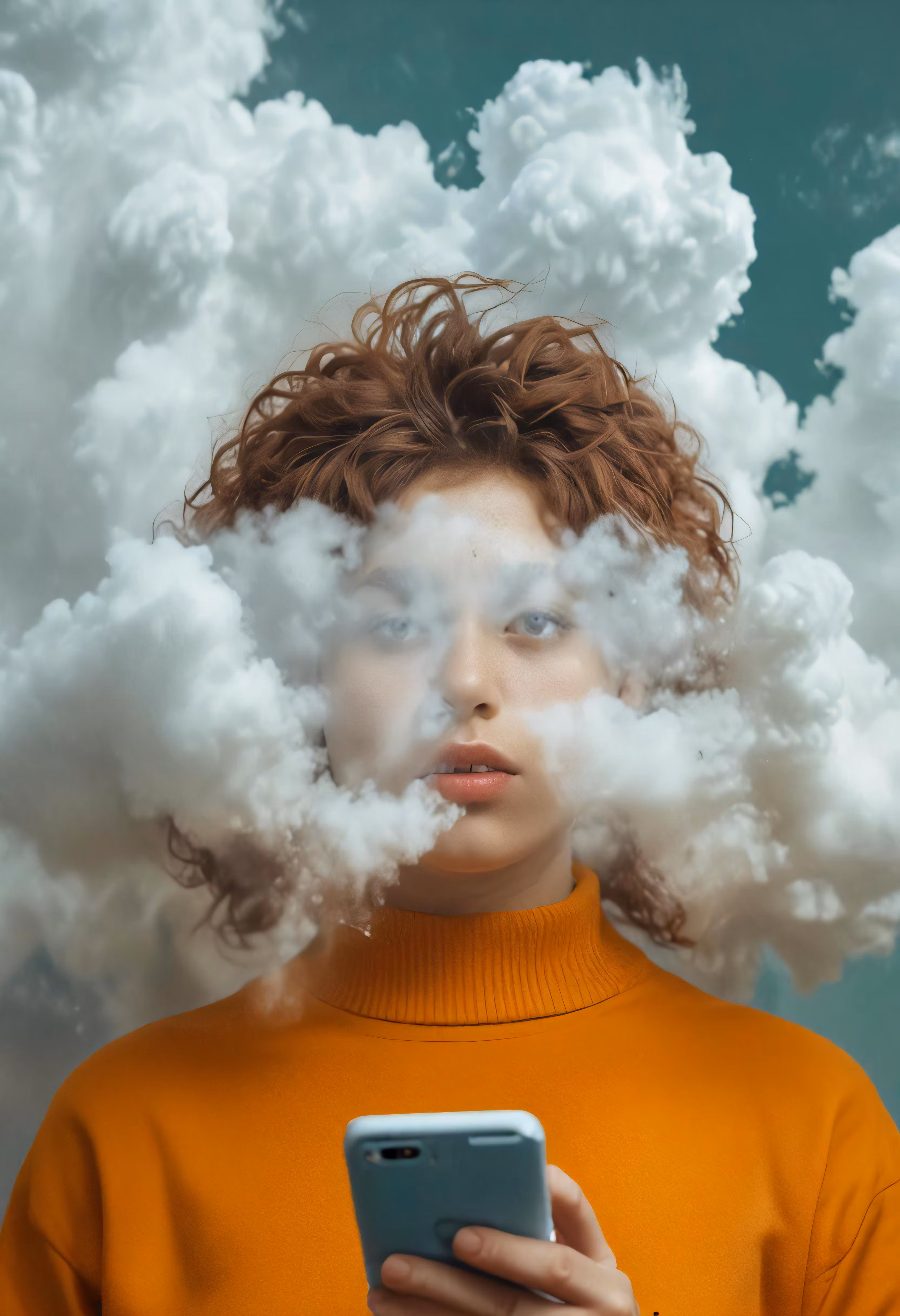 High resolution picture, free to use, a woman is standing while she uses her cell phone to smoke a cloud