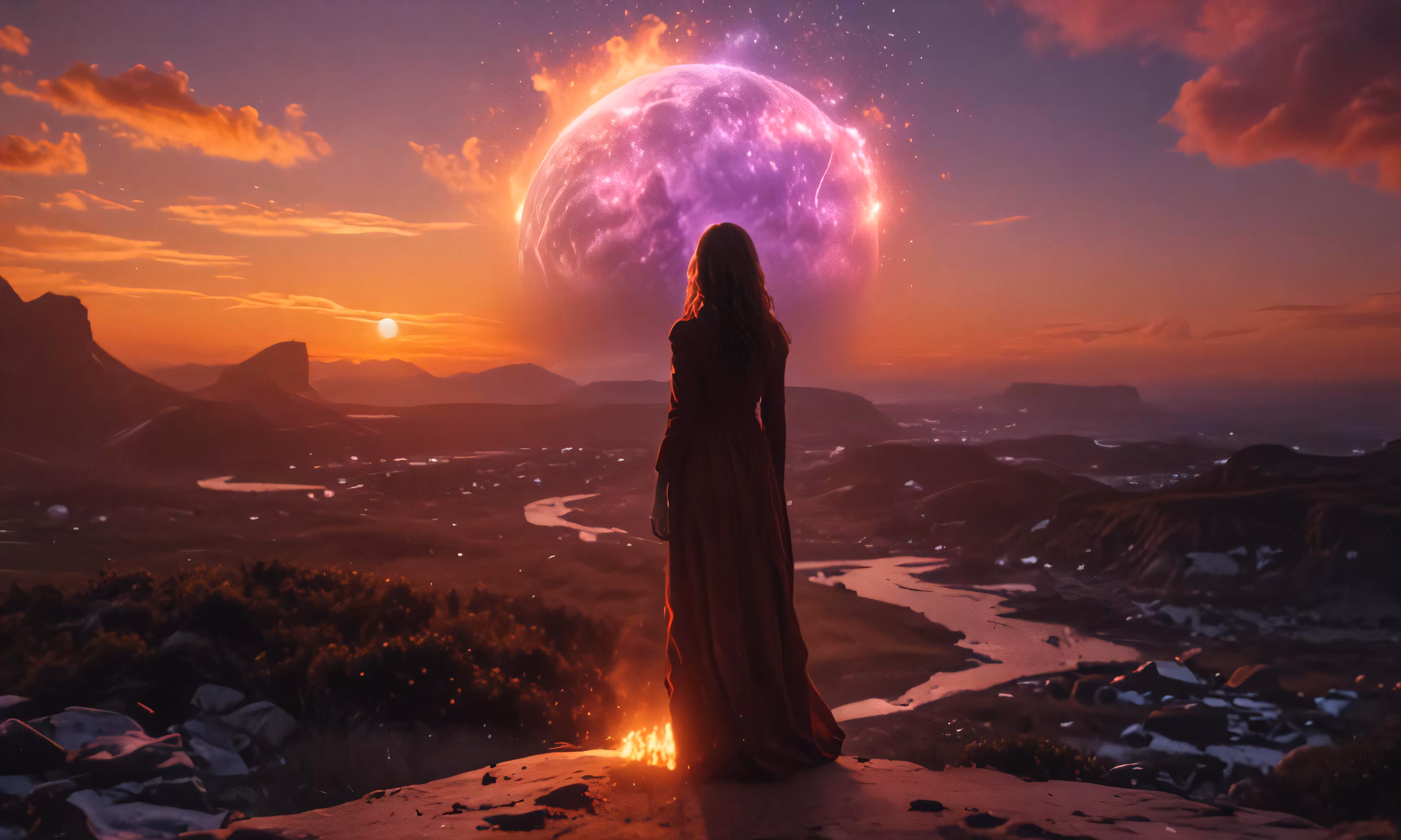 High resolution picture, free to use, a woman is staring up at a purple moon