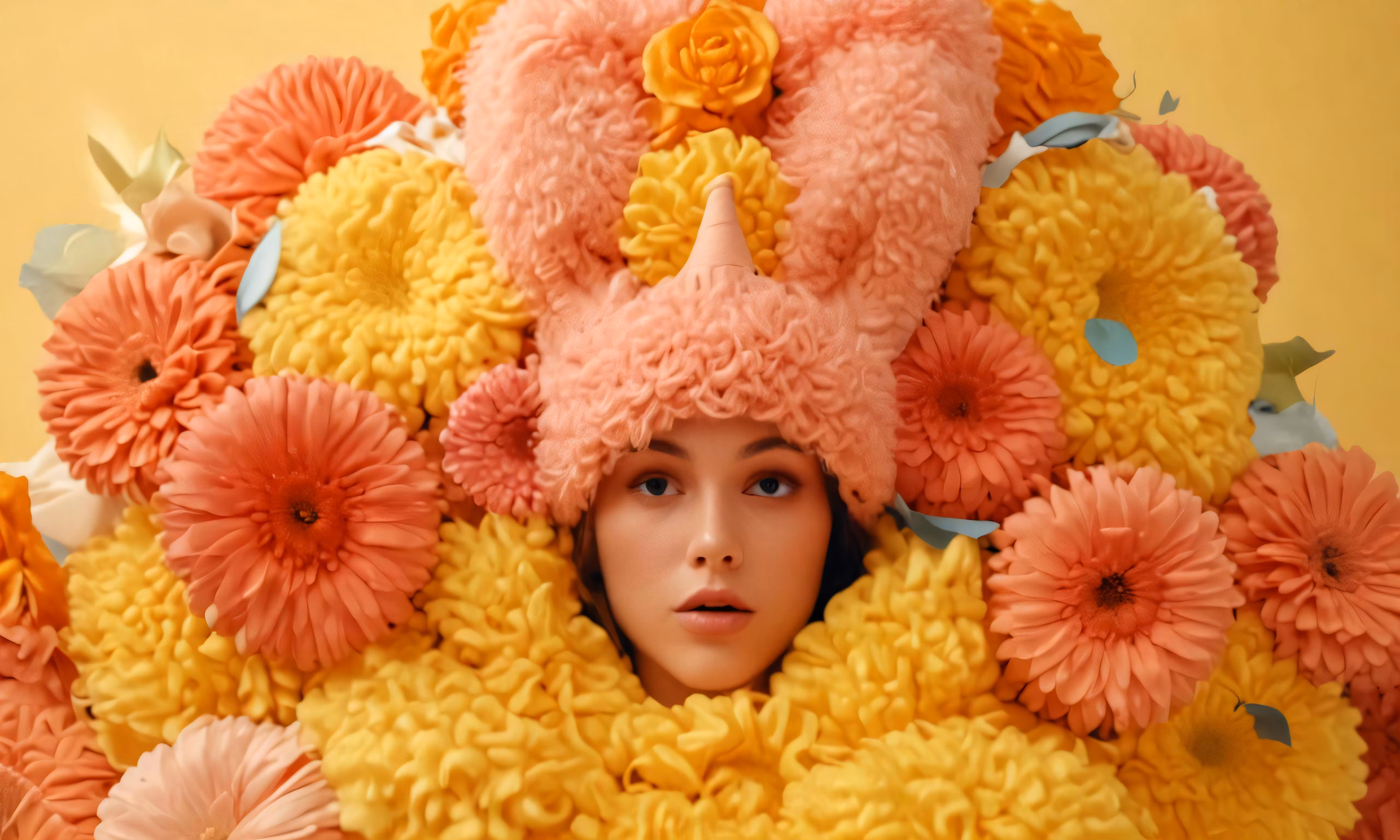 High resolution picture, free to use, a woman is surrounded by flowers and plush toys