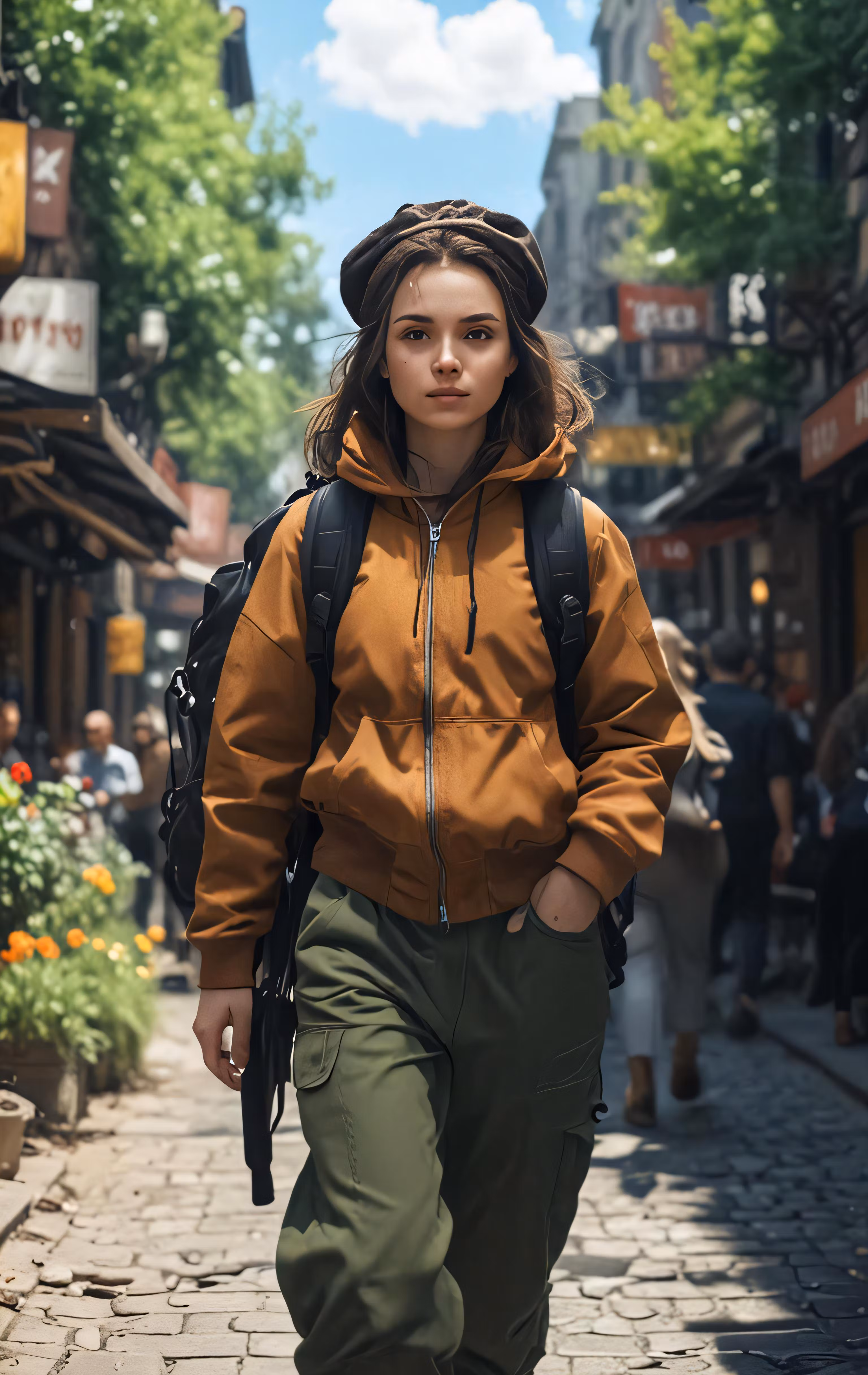 High resolution picture, free to use, a woman is walking down a street, with backpacks on her shoulders